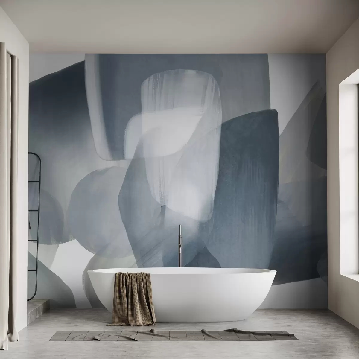 Fototapeedid Abstraktsed tekstuuriga kujundid vaoshoitud sinistes ja hallides toonides, pehmetes servades ja üksteisega kattuvates kihtides. Nr w09642v1