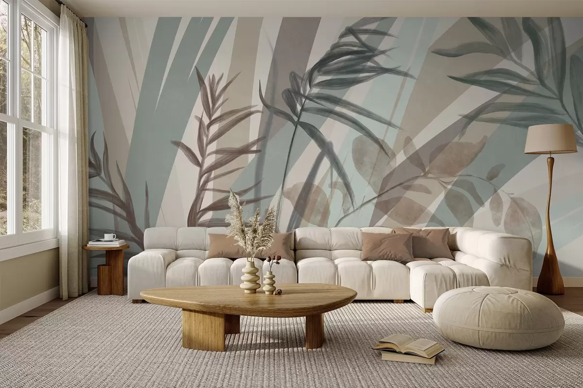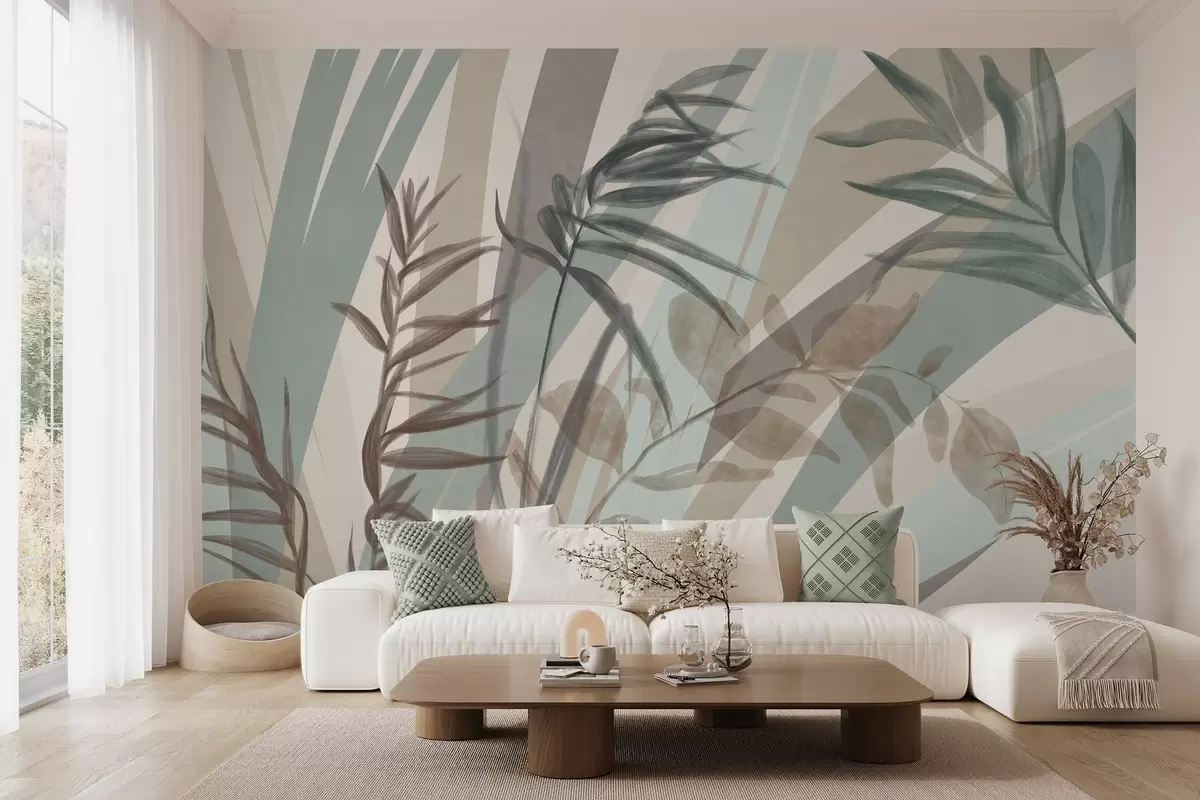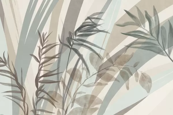 Fototapeedid Pikk tekstuuriga rohi ja lehed mahedates maatoonides, taustal abstraktsed jooned, mis loovad orgaanilise mustri. Nr w09643