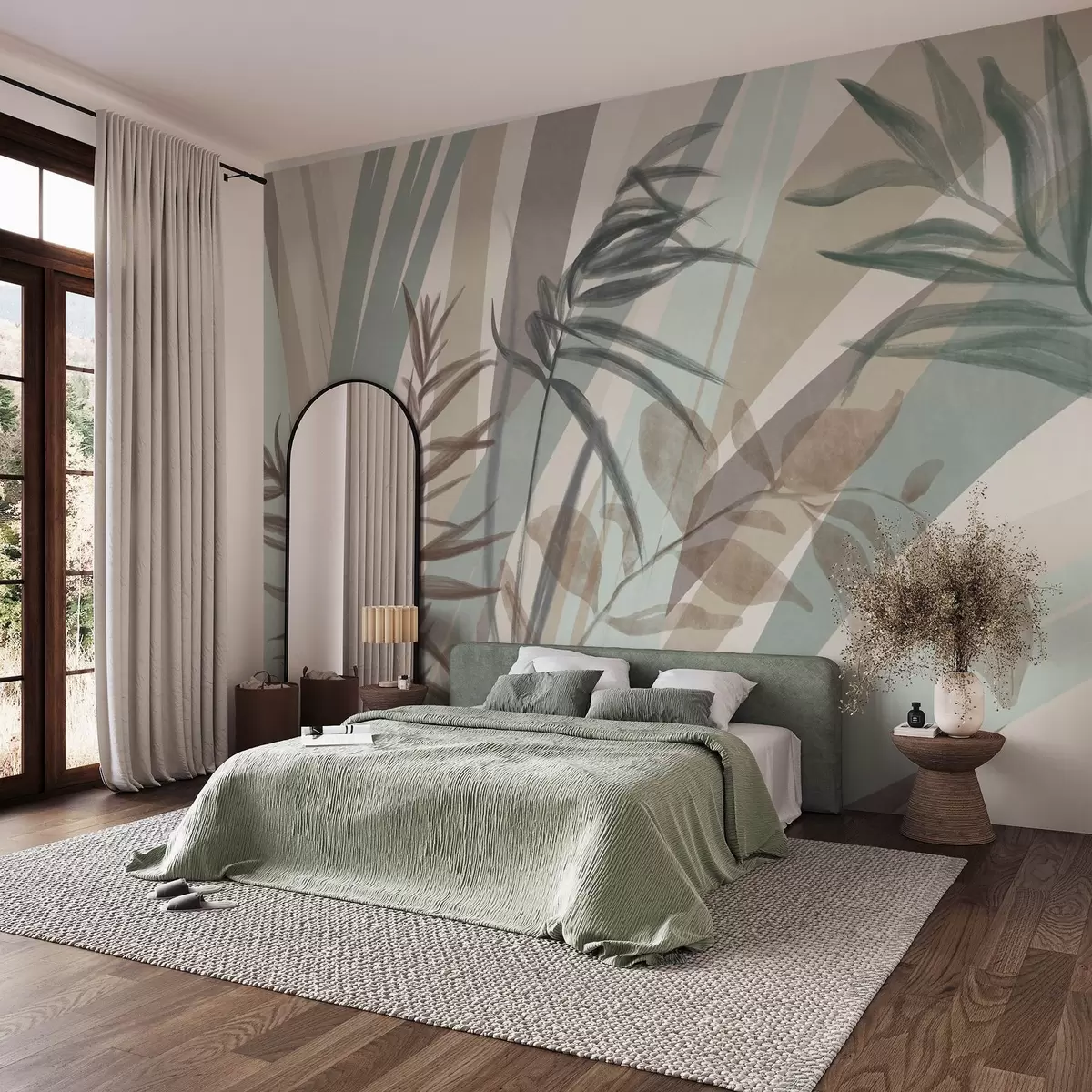Fototapeedid Pikk tekstuuriga rohi ja lehed mahedates maatoonides, taustal abstraktsed jooned, mis loovad orgaanilise mustri. Nr w09643