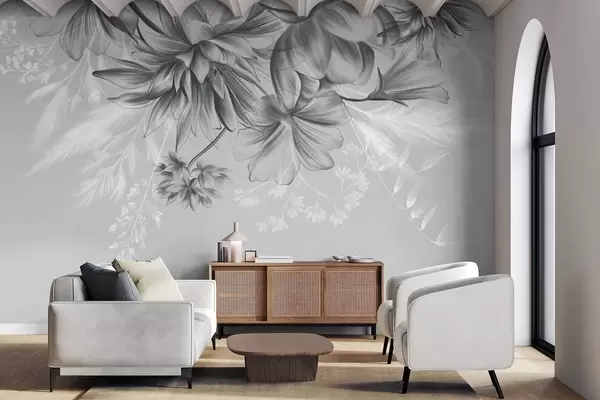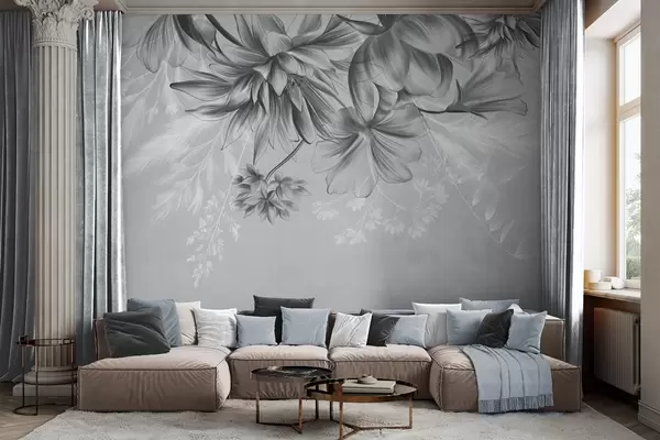 Fototapeedid Tekstuuriga lilled ja sõnajalad tumedates halli ja valge toonides vaoshoitud halli taustaga joonistamisstiilis Nr w09644v1