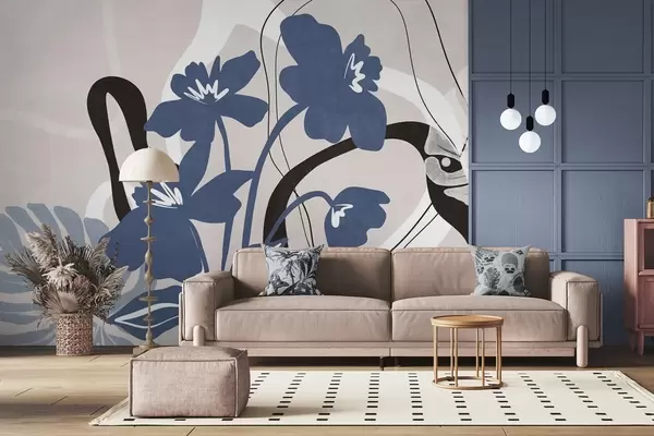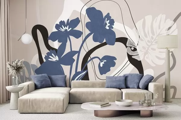 Fototapeedid Abstraktsed tekstuuriga sinised lilled valge ja musta kujunditega helebeežil taustal, minimalistlik kunst Nr w09645
