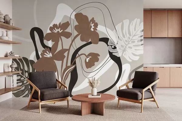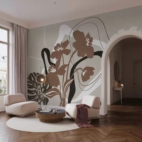 Fototapeedid Abstraktsed tekstuuriga pruunid lilled valge ja musta kujunditega beeži taustal, minimalistlik kunst Nr w09645v1
