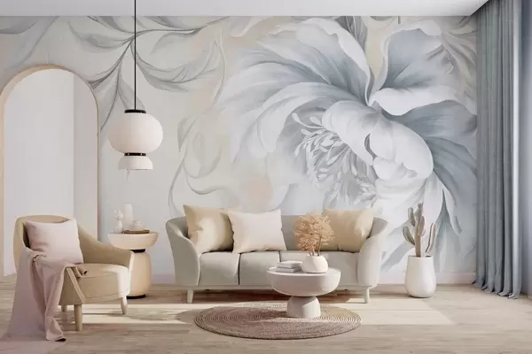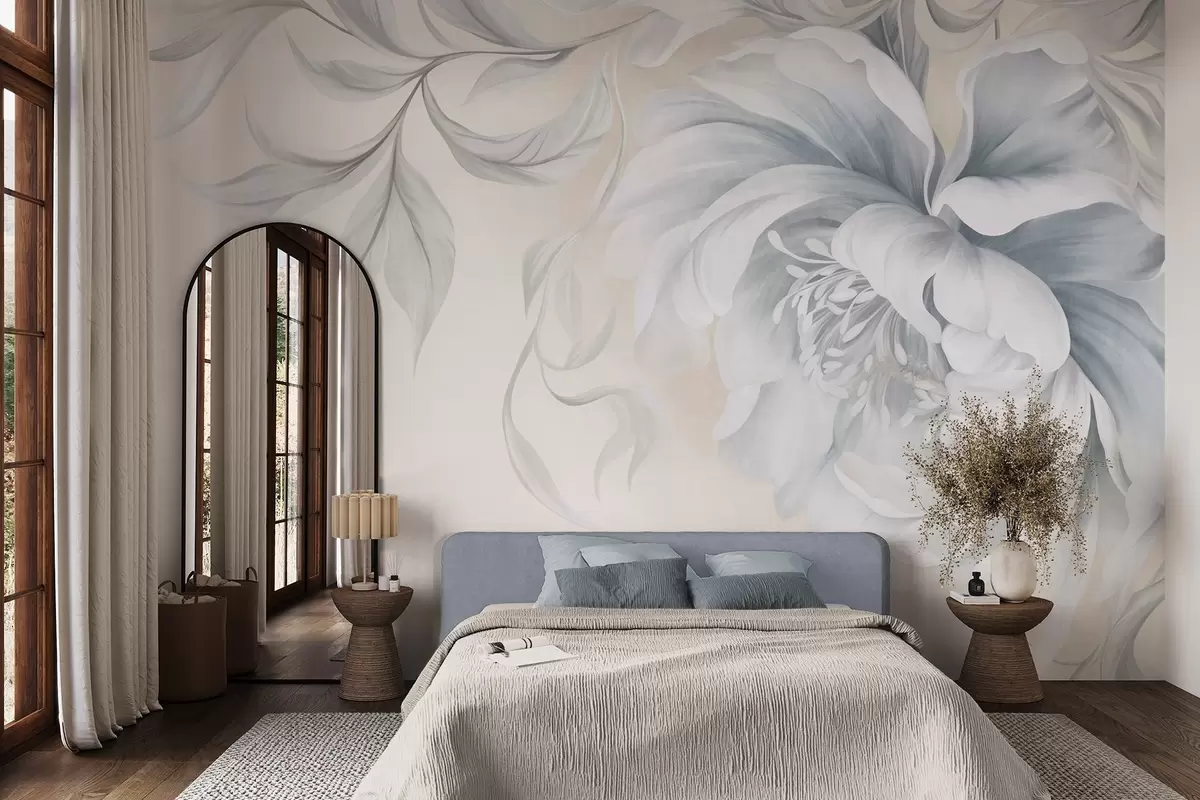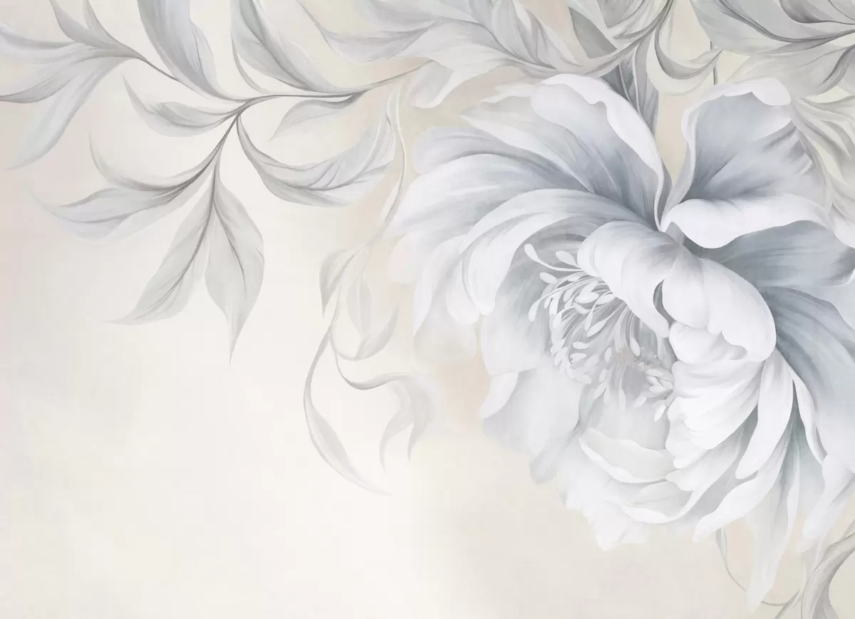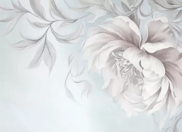 Fototapeedid Suur, tekstuurne pioon õrnadele kroonlehtedele ja hallidele lehtedele, maalitud pehmes stiilis Nr w09647