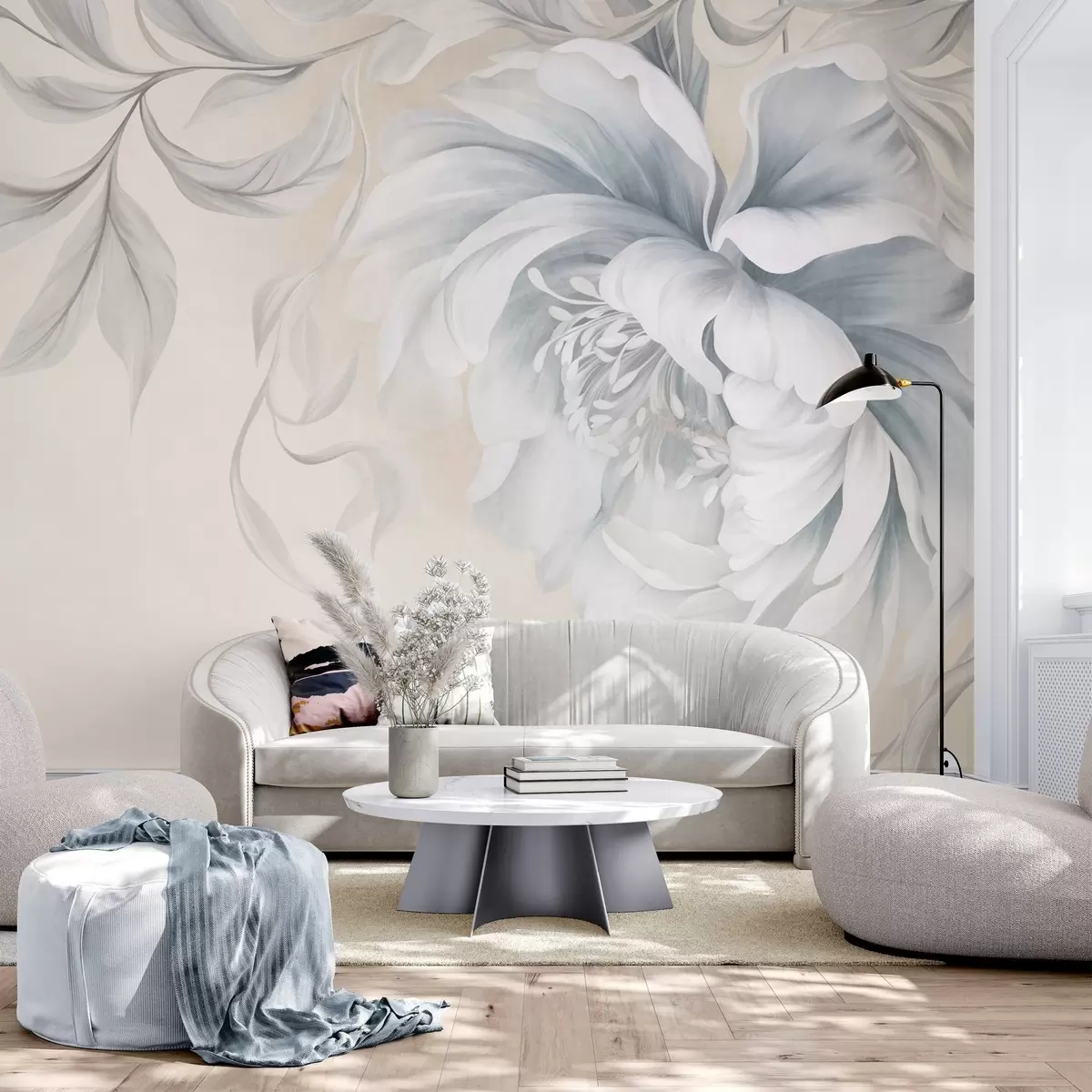 Fototapeedid Suur, tekstuurne pioon õrnadele kroonlehtedele ja hallidele lehtedele, maalitud pehmes stiilis Nr w09647