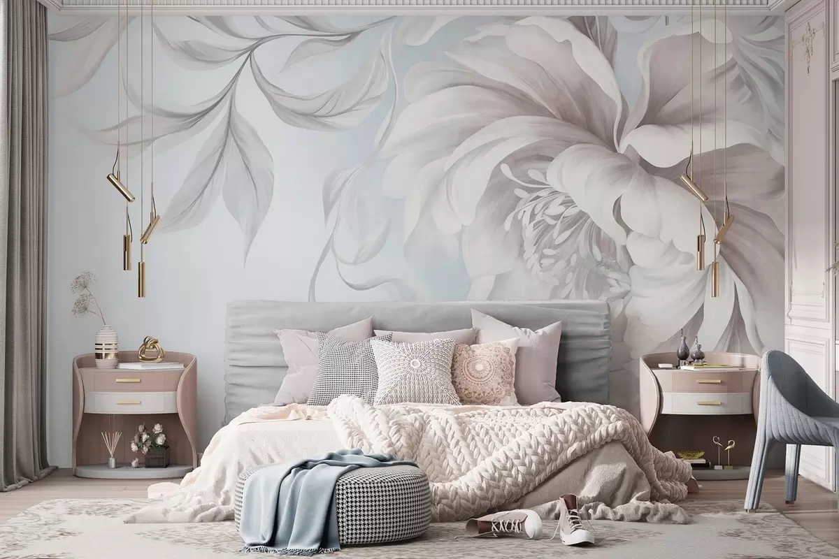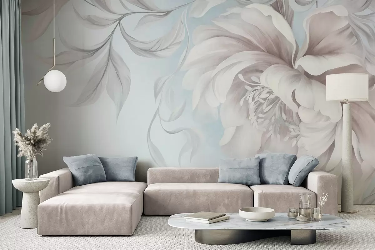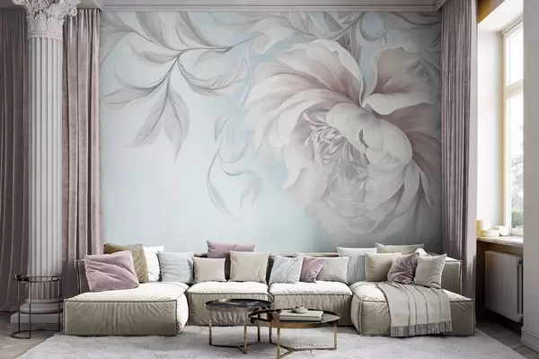 Fototapeedid Suur, tekstuurne pioon õrnadele kroonlehtedele ja hallidele lehtedele, maalitud pehmes stiilis Nr w09647v1