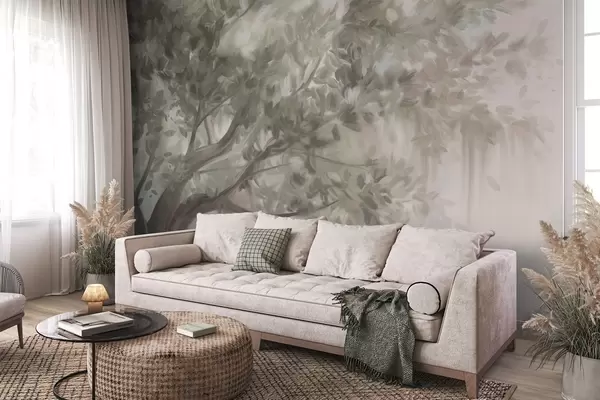 Fototapeedid Tekstuuriga puu heleroheliste lehtede ja okstega, pehme, uduse taustaga Nr w09650