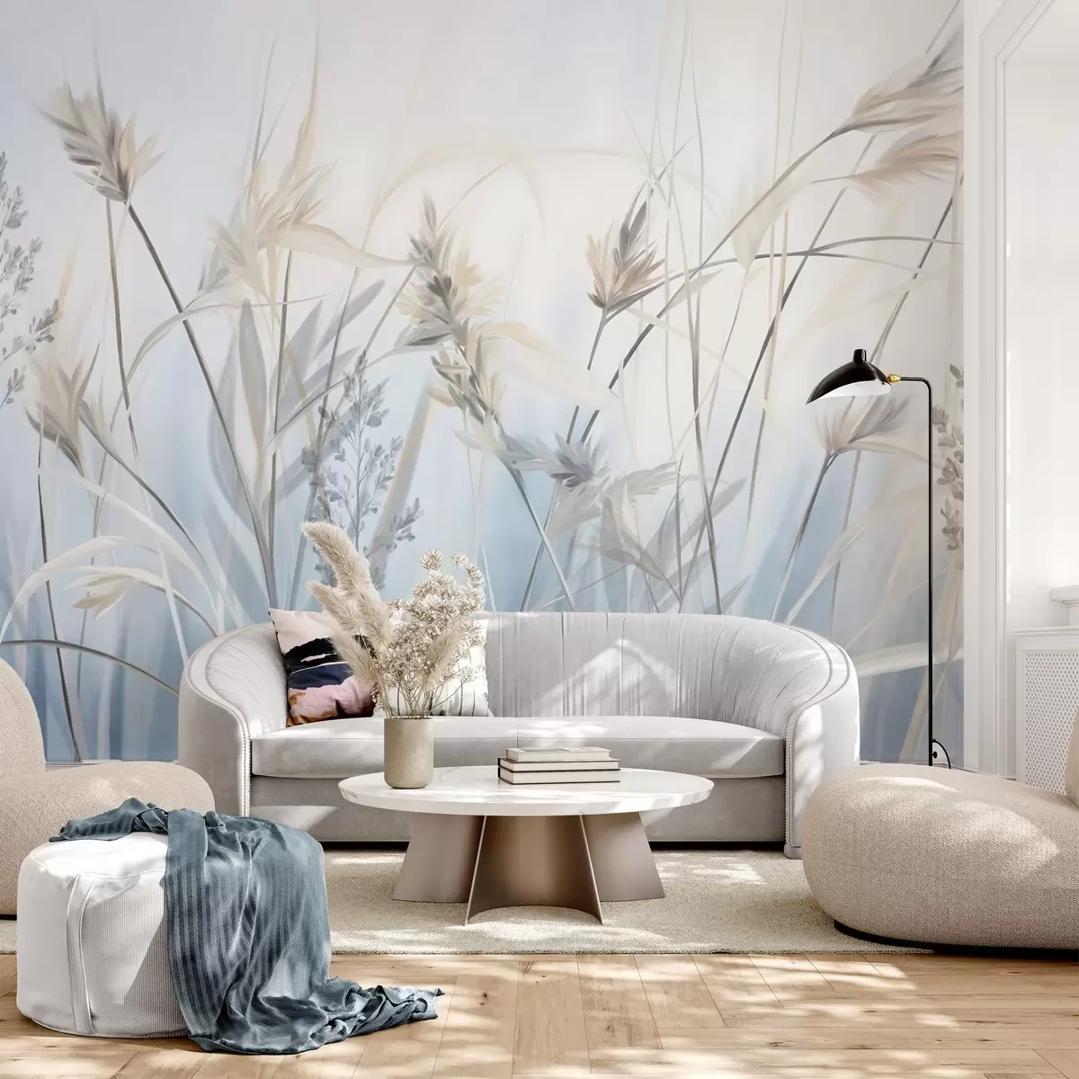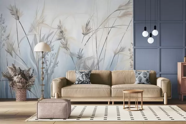 Fototapeedid Kõrged, kuivad rohtu varred sulgkergete tippudega, pehmed, udused sinised ja valged taustad Nr w09652