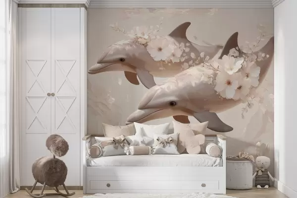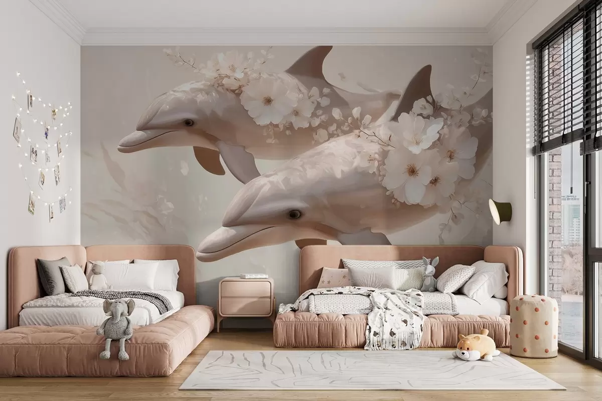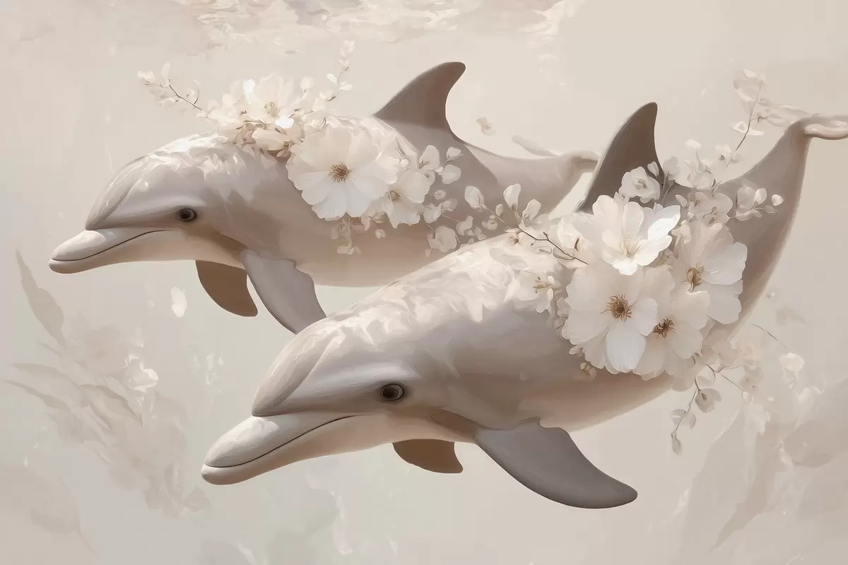 Fototapeedid Delfiinid õrna lillede ja pehme valguse ookeanis Nr w09666
