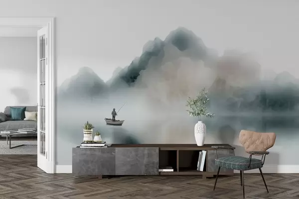 Fototapeedid Mägimaastik, kus paat ja kalamees sulavad pehmesse udu Nr w09678