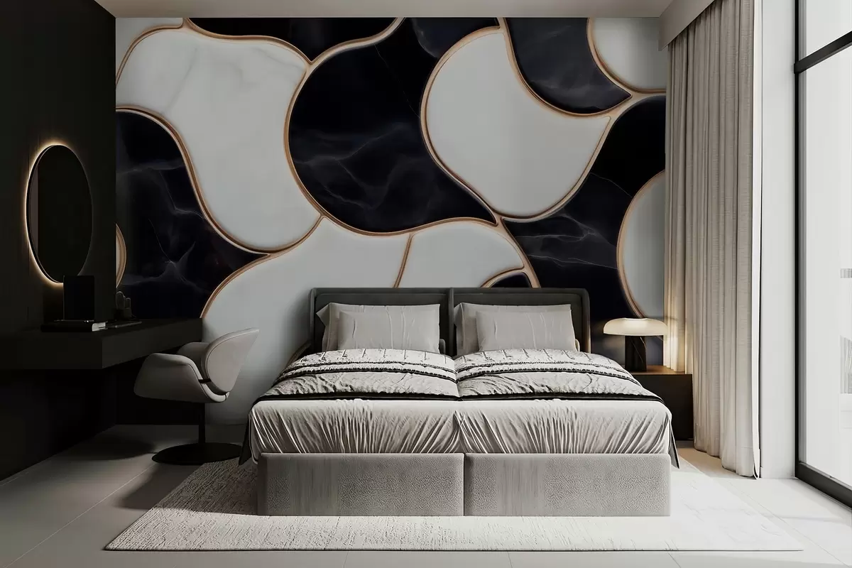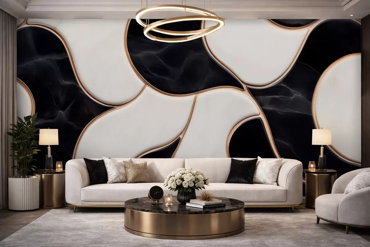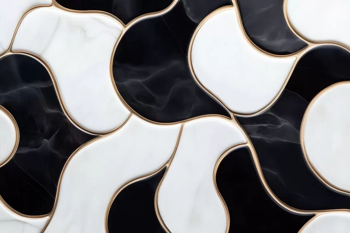 Fototapeedid Marmorist kompositsiooni abstraktne imitatsioon must-valgetes toonides ja kollaste joontega Nr w09733