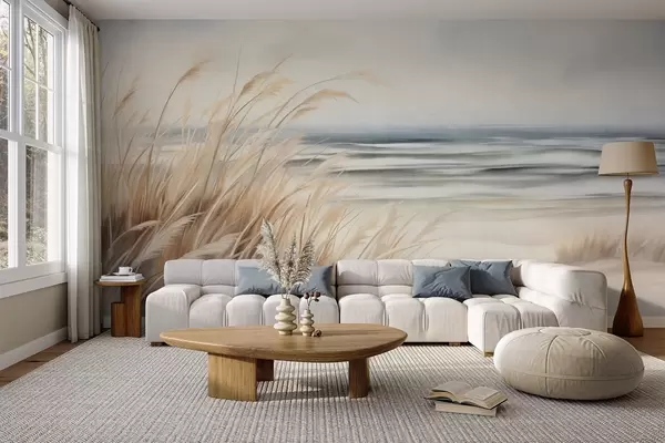Fototapeedid Tekstuuriga maastik kuiva rohu ja liivase rannaga, taustal ookean ja taevas Nr w09739