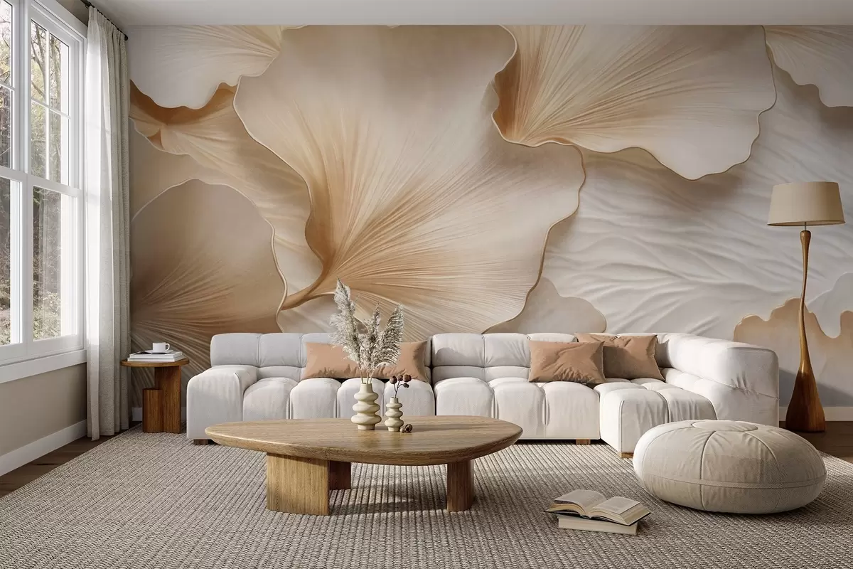 Fototapeedid Tekstuuriga, beežid ja valged ginkgo lehed õielehed delikaatse orgaanilise trükiga Nr w09741