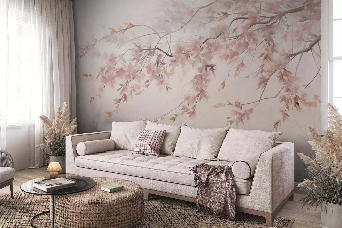 Fototapeedid Tekstuuriga maastik kirsiõiteoksaga, roosade lehtede ja pehme, uduse taustaga Nr w09743