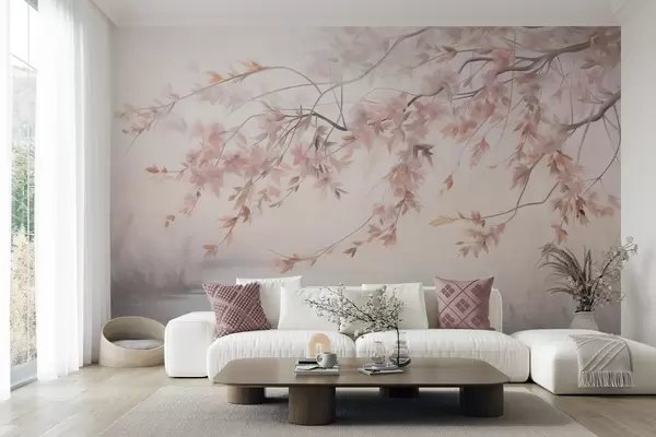 Fototapeedid Tekstuuriga maastik kirsiõiteoksaga, roosade lehtede ja pehme, uduse taustaga Nr w09743