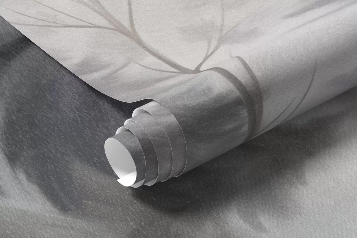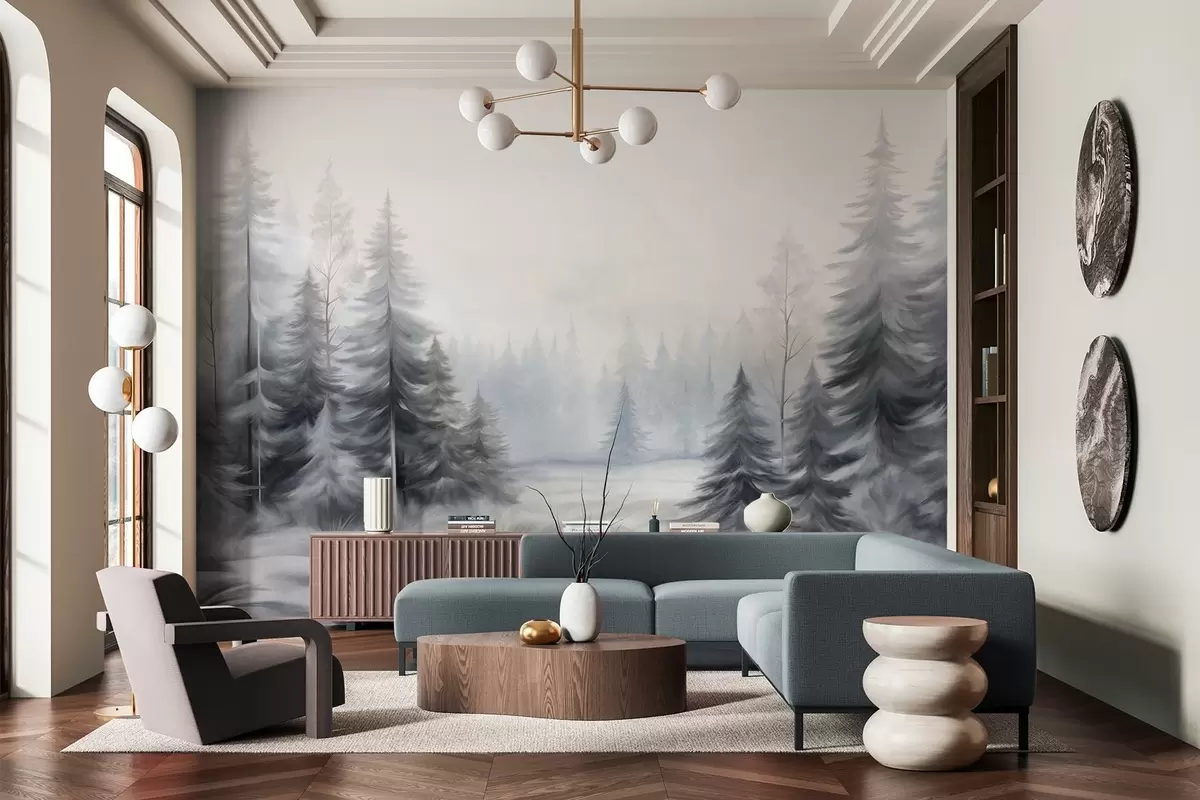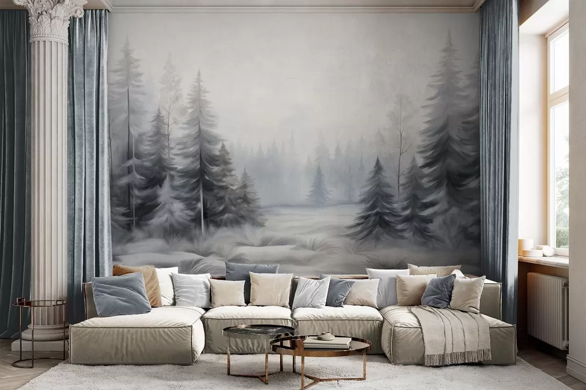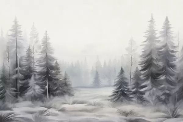 Fototapeedid Tekstuuriga talve mets puud udus, summutatud halli ja valge toonides Nr w09745