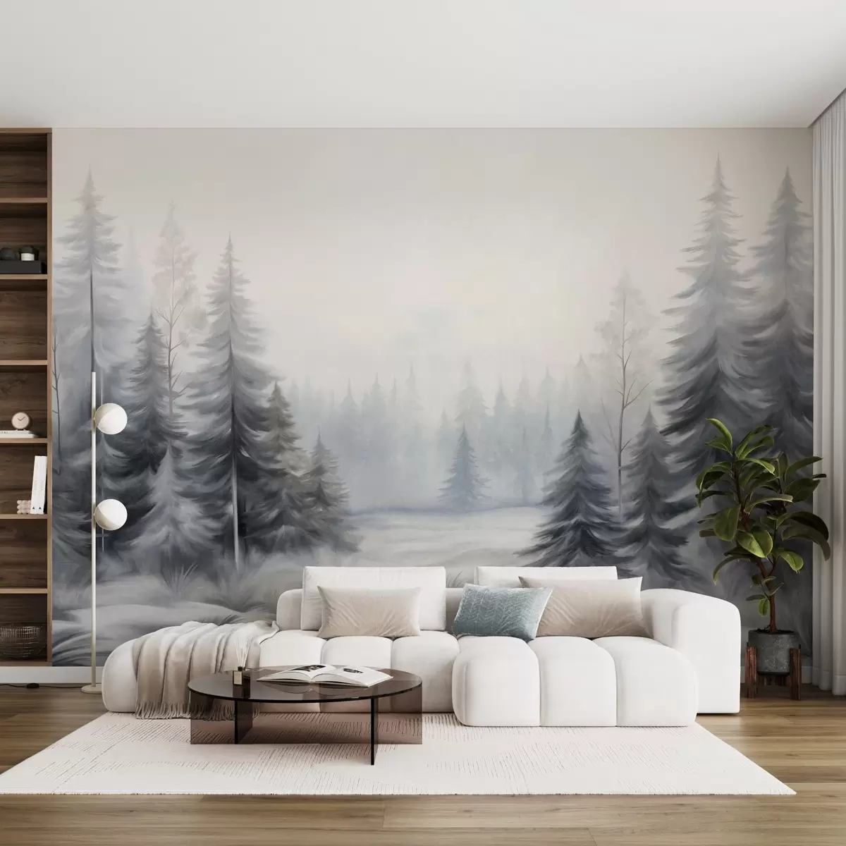Fototapeedid Tekstuuriga talve mets puud udus, summutatud halli ja valge toonides Nr w09745