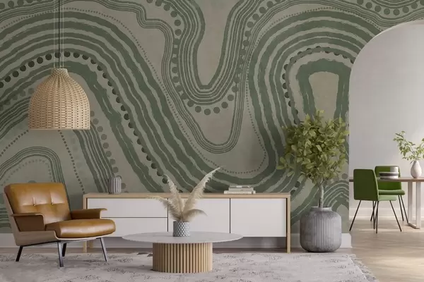 Fototapeedid Abstraktsed rohelised ja beežid lainelised jooned ja punktid, modernne tekstuuriga kunst Nr w09747