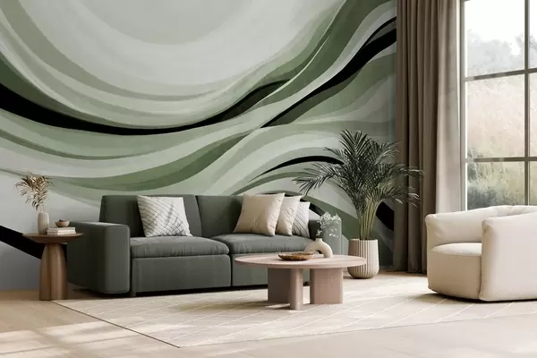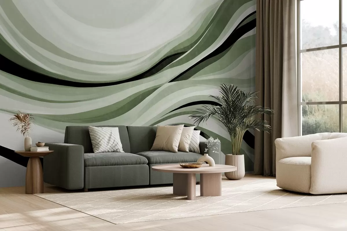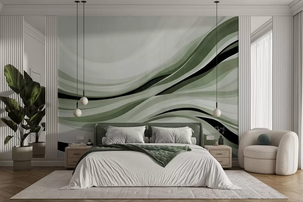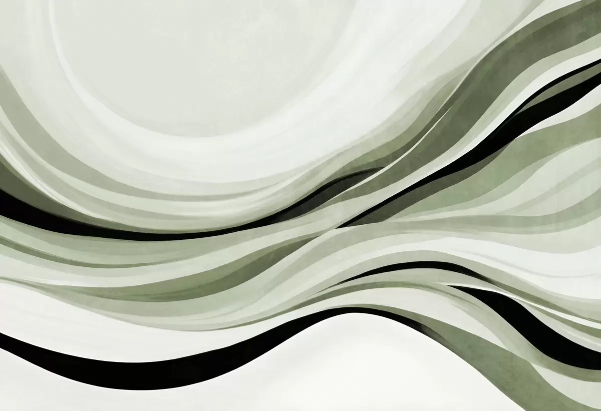 Fototapeedid Abstraktsed lainelised jooned rohelistes ja mustades toonides heledal taustal, tekstuuriga kunst Nr w09748v1