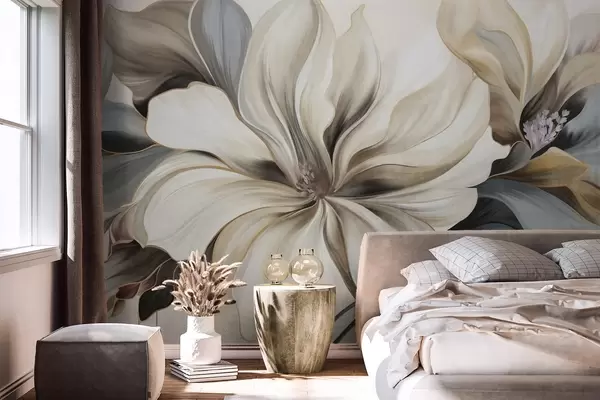 Fototapeedid Suured, kreemjad magnoliaõied pruunide ja hallide lehtedega, pehme valgustus, abstraktne taust Nr w09749