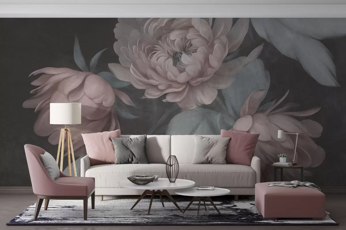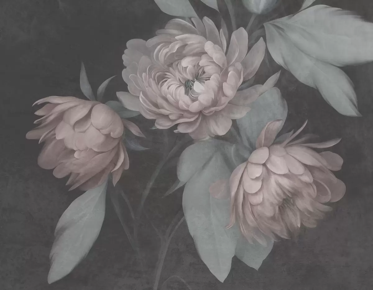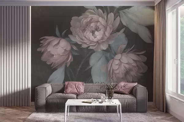 Fototapeedid Tekstuuriga heleroosaid pioniõisi ja mahedat rohelist lehtede kontrastiga tumedal taustal Nr w09751v1