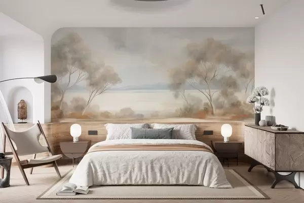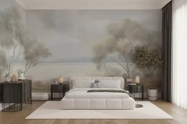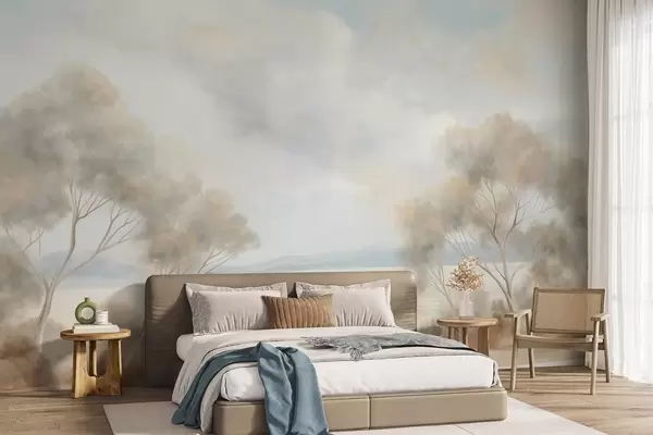 Fototapeedid Maastikuline tekstuuriga maalistiil, millel on puud pilvise taeva all Nr w09753