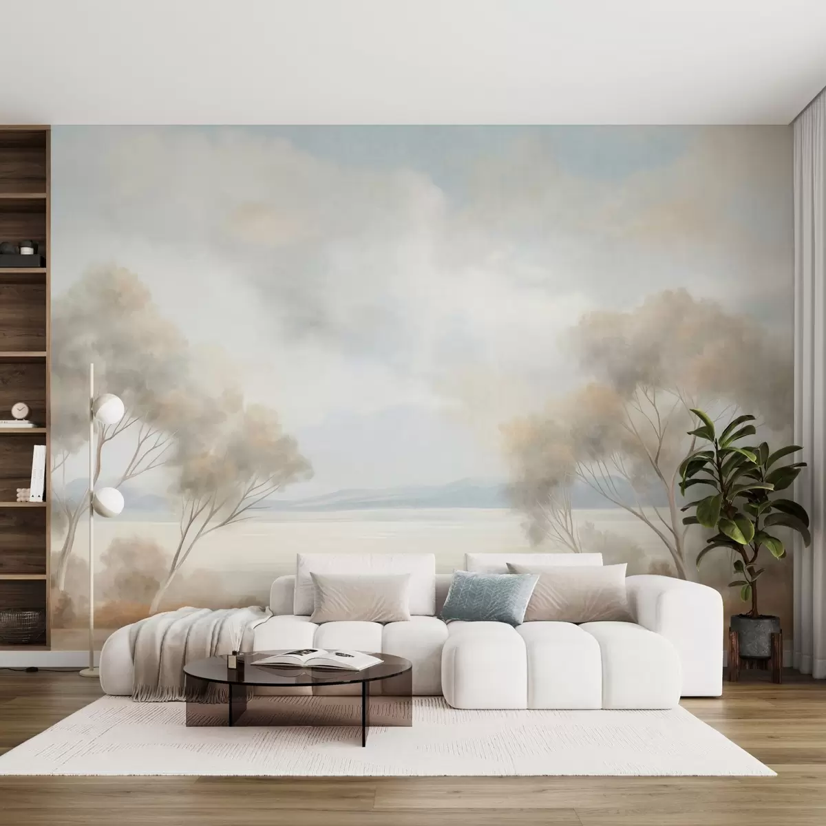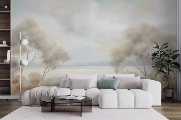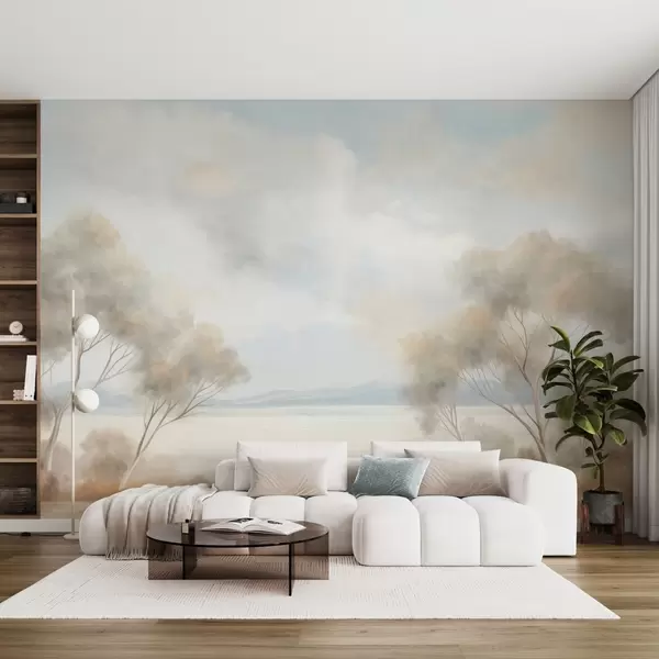 Fototapeedid Maastikuline tekstuuriga maalistiil, millel on puud pilvise taeva all Nr w09753