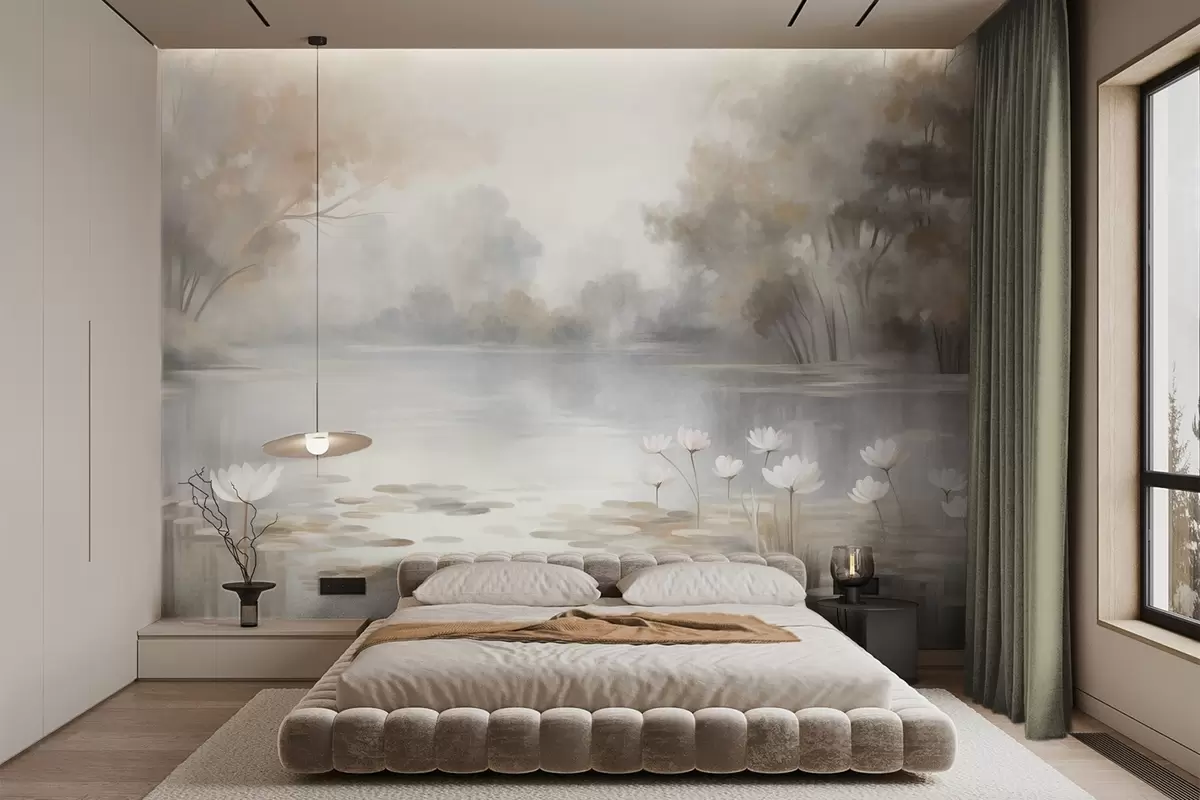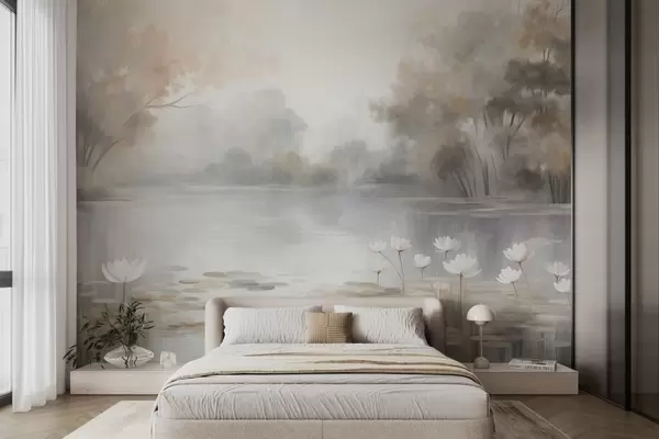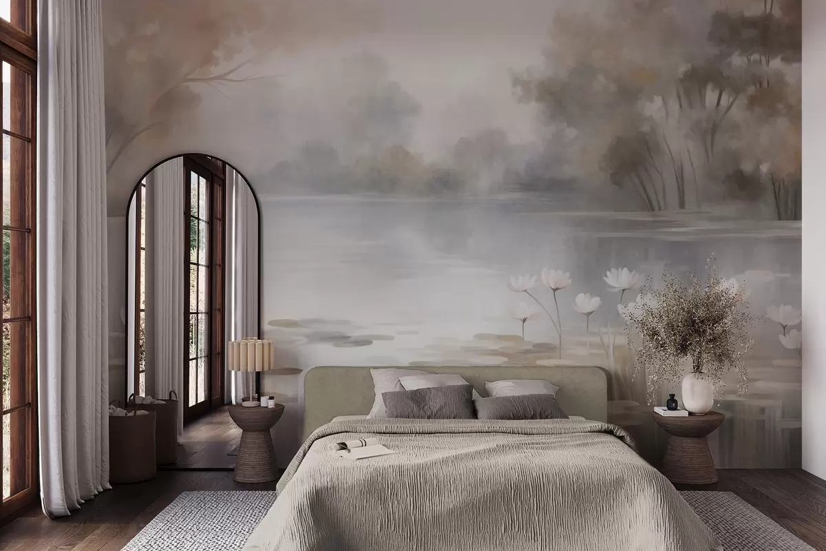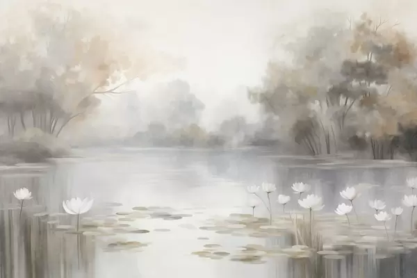 Fototapeedid Kõrgendustega maastik, valgeid vesililli täis järv, mida ümbritsevad vaoshoitud värvitoonidega puud Nr w09768