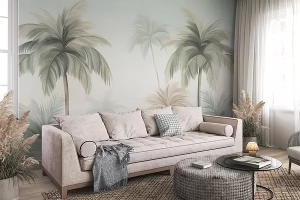 Fototapeedid Palmipuud, mille lehed on pehmet rohelist ja beeži tooni, pehme taeva taustal Nr w09770