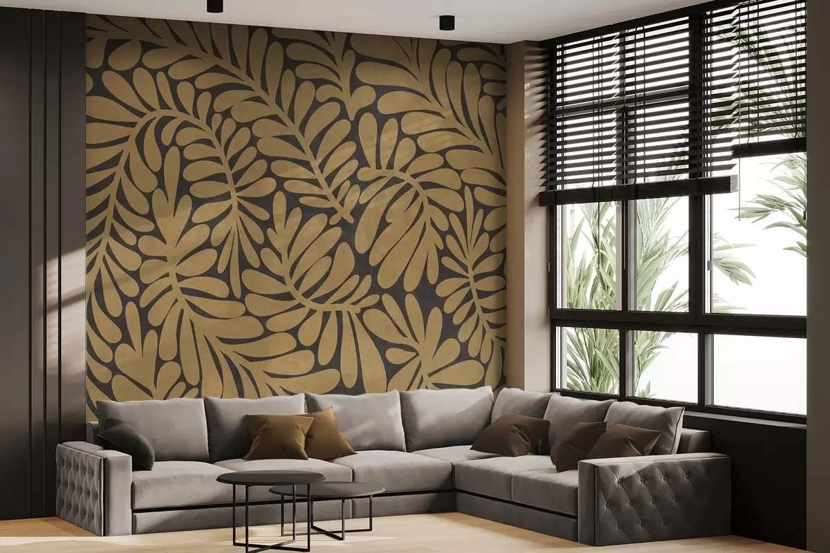 Fototapeedid Tumehalli taustal stiliseeritud sinepikollased lehed, tekstuuriga kunstiteos Nr w09775