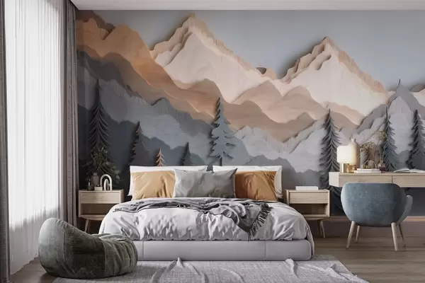 Fototapeedid Loodusmaastik mändide ja mägedega, puidust nikerdatud stiilis Nr w09793