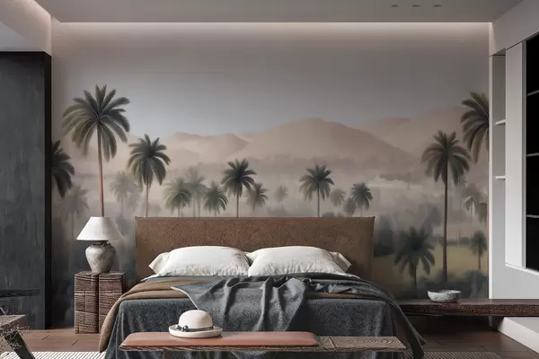 Fototapeedid Troopiline maastik palmipuude ja mägedega, vintage-panoraam beeži ja rohelistes toonides Nr w09798