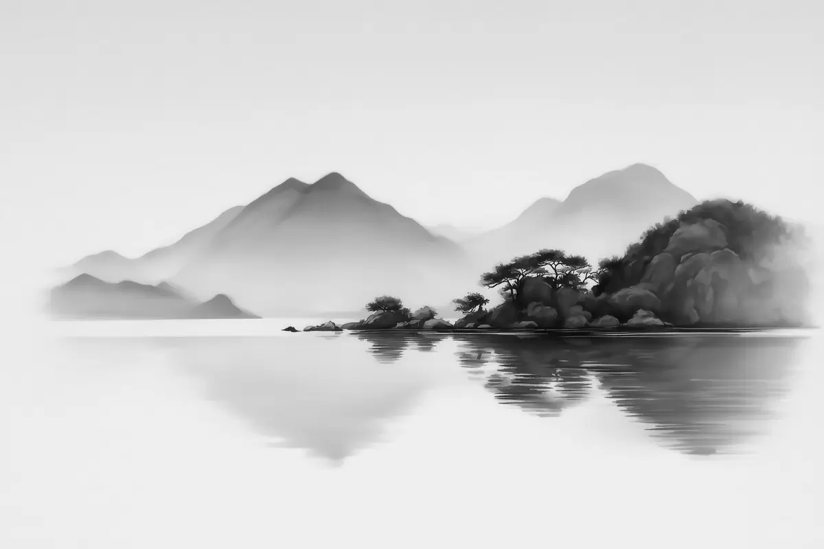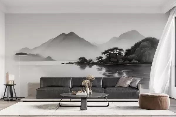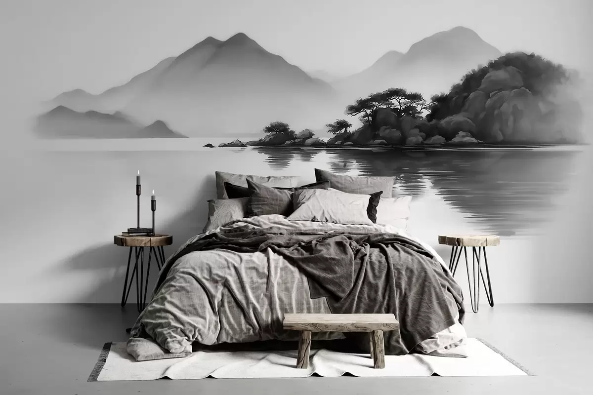 Fototapeedid Mustvalge maastik, kus mäed ja järv on pehmes udus Nr w09803