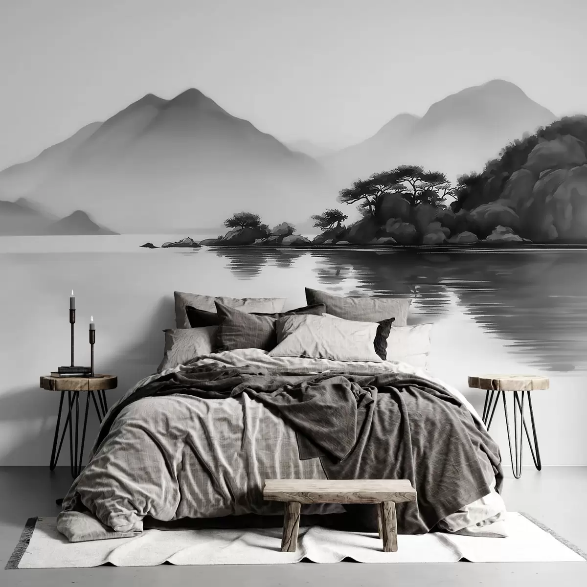 Fototapeedid Mustvalge maastik, kus mäed ja järv on pehmes udus Nr w09803