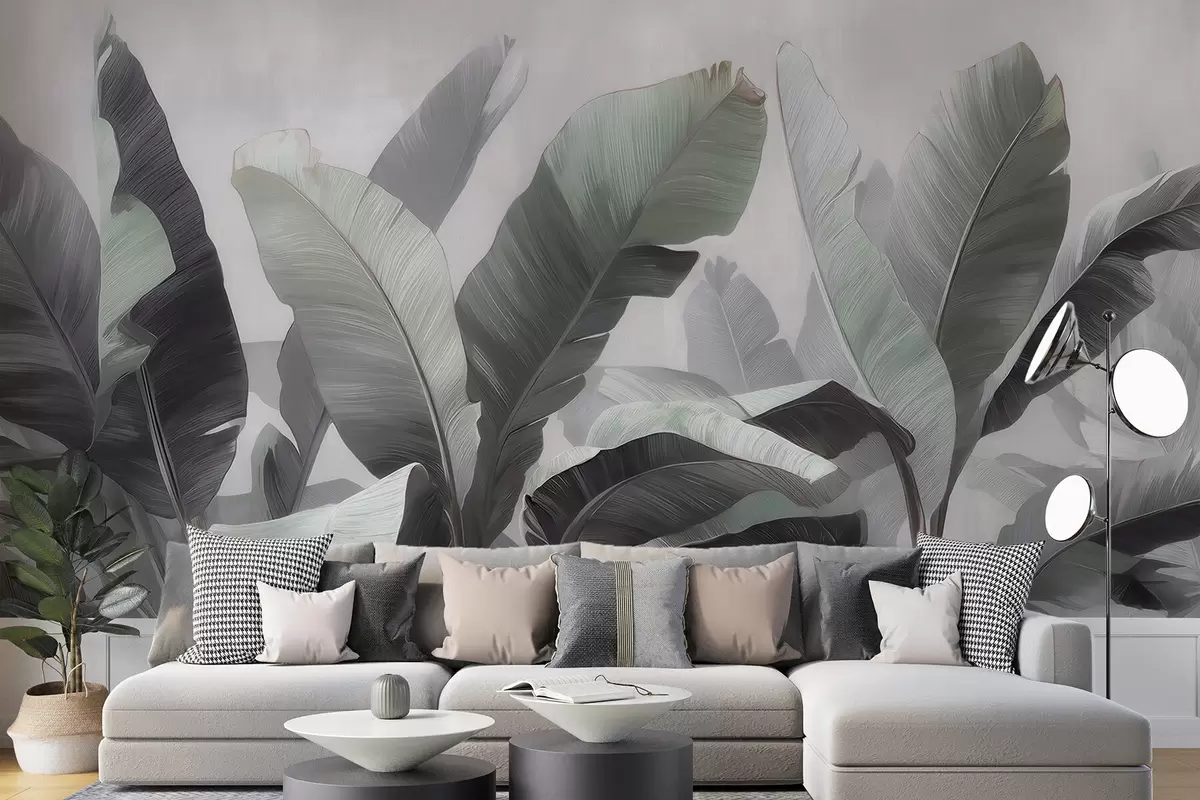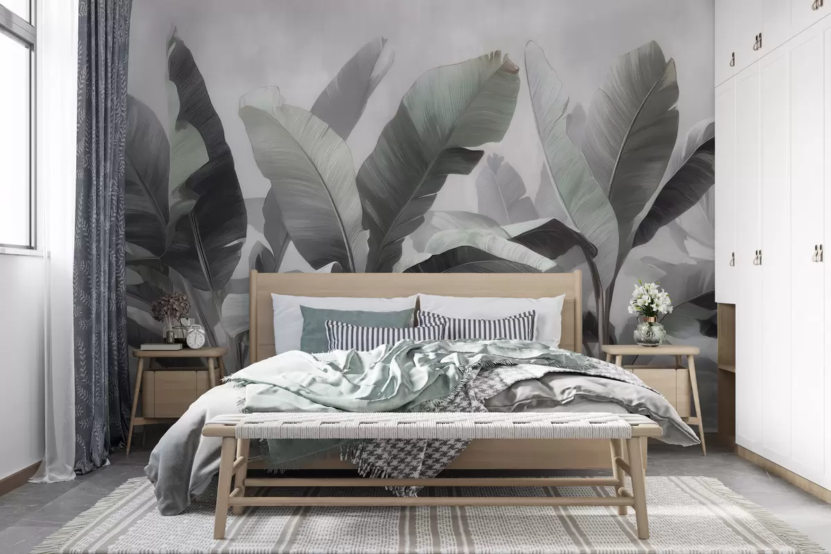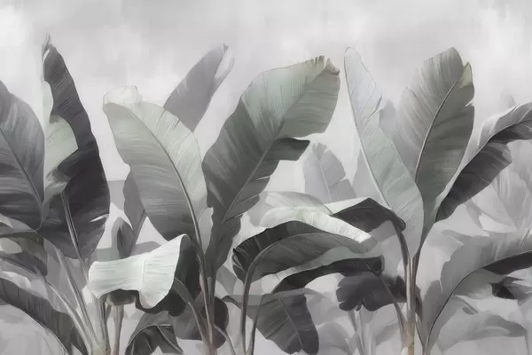 Fototapeedid Abstraktsed troopilised suured banaanilehed neutraalses värvipalettis, milles domineerivad pehmed hallikasrohelised toonid Nr w09805