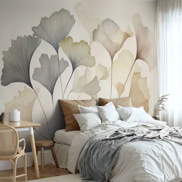 Fototapeedid Kokkuvõte: ginkgo lehed vaoshoitud pastelltoonides, nagu sinine, roheline ja virsiku värvi, tekstuuriga kunstiteos Nr w09810