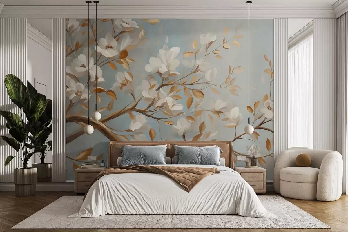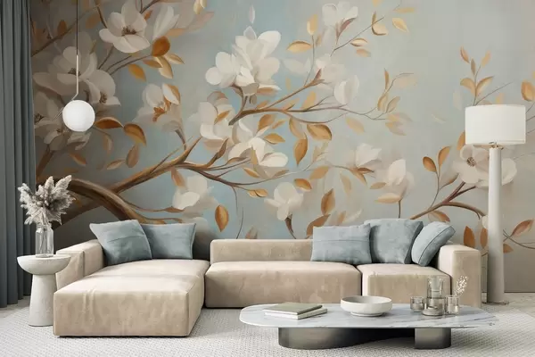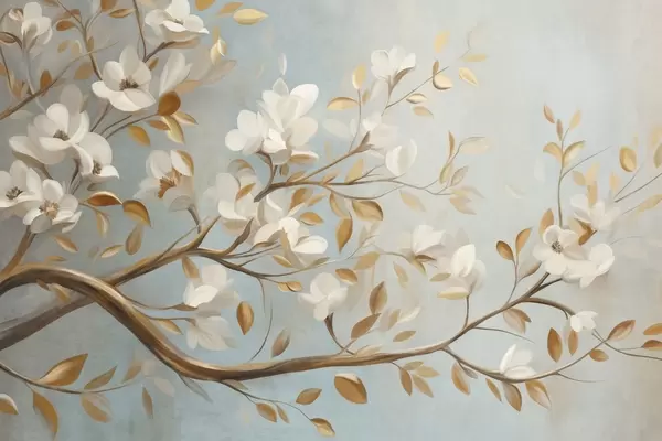 Fototapeedid Tekstuuriga puuoks valgetele õitele ja kollastele lehtedele, vintage-stiilis Nr w09814