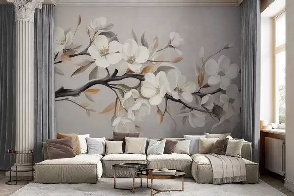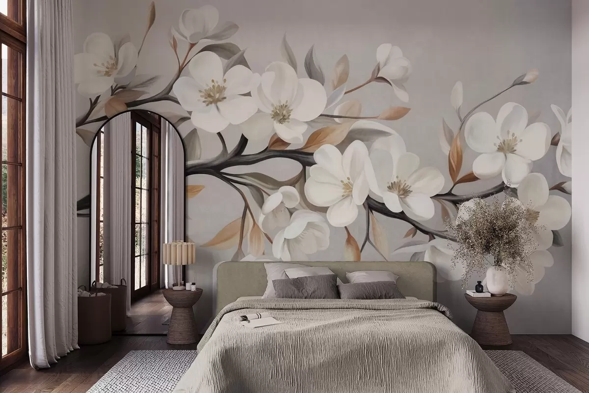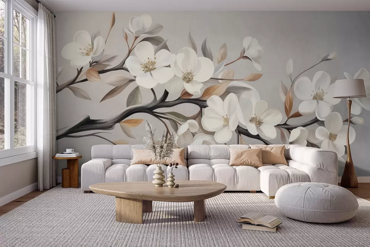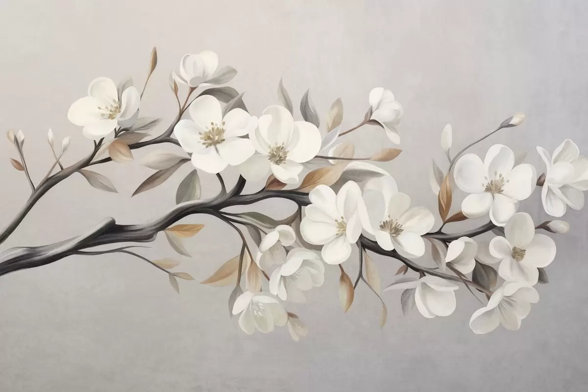Fototapeedid Tekstuurne oks valgetega õitega ja pruunide lehtedega helerohelisel taustal Nr w09817
