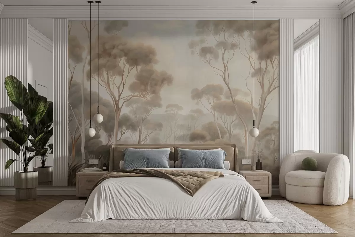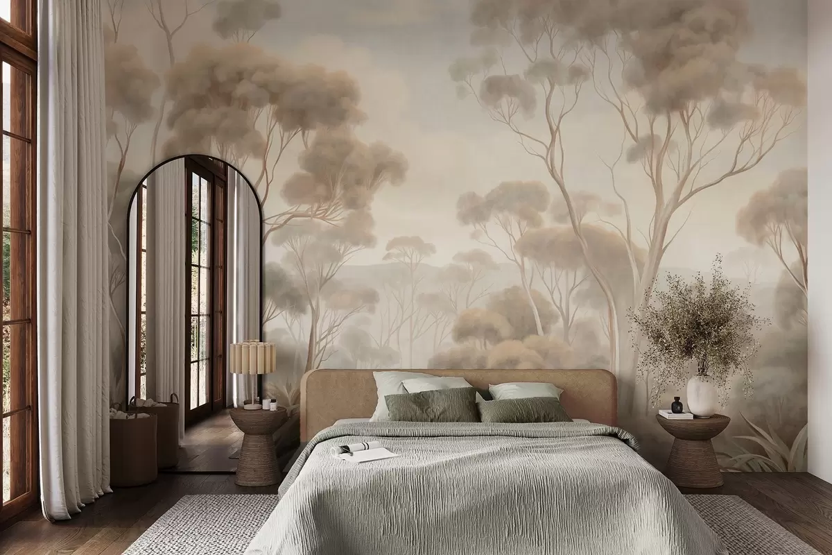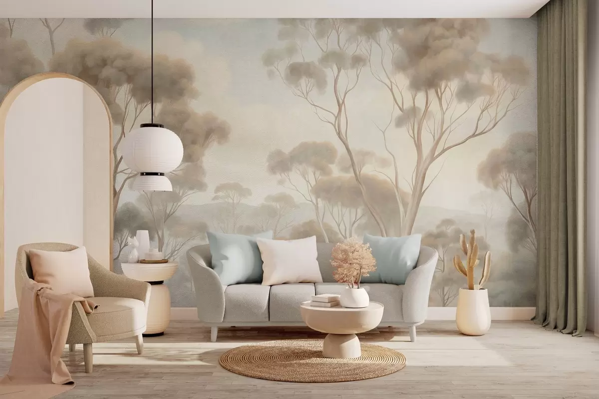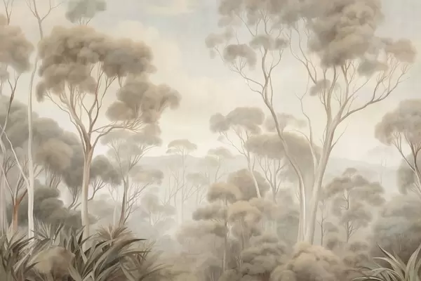 Fototapeedid Uduvõrkudes metsamaastik kõrgetega eukalüptipuudega, künklike mägedega pilvise taeva all, tekstuurne kunstiteos Nr w09822
