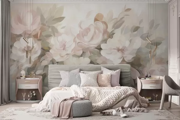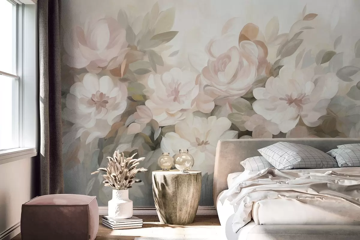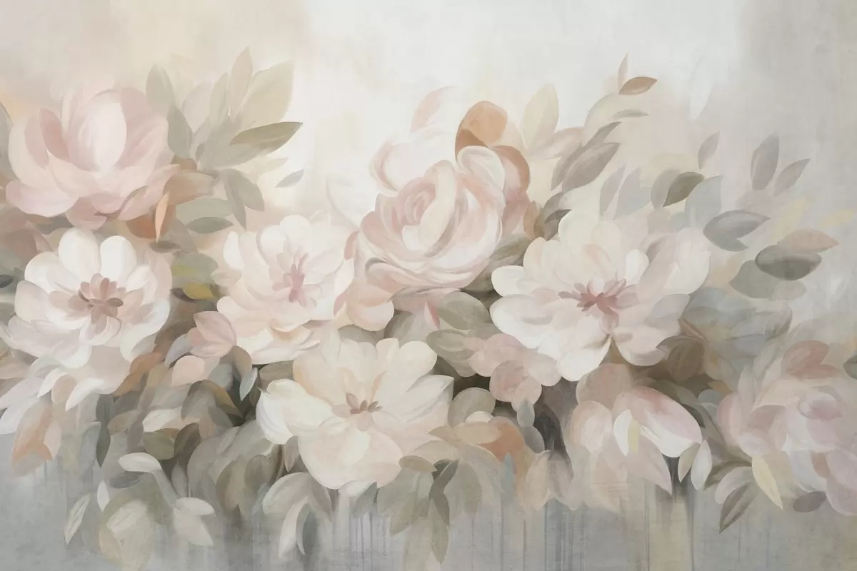 Fototapeedid Hele-roosad ja valged lilled roheliste lehtedega, maalitud stiilis, impressionistlikus stiilis, tekstuurne kunst Nr w09824