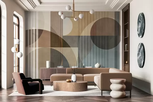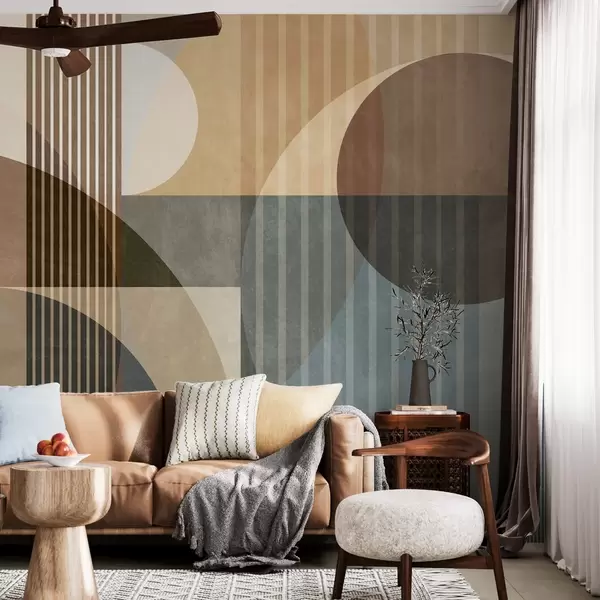 Fototapeedid Abstraktsed geomeetrilised kujundid ringide ja joontega, vaoshoitud maatoonid, tekstuurne, kihiline kompositsioon Nr w09834
