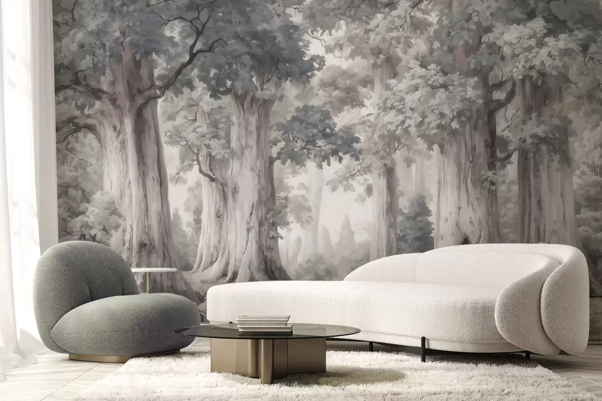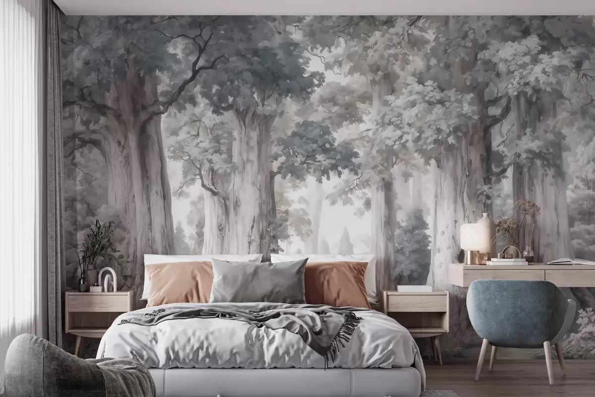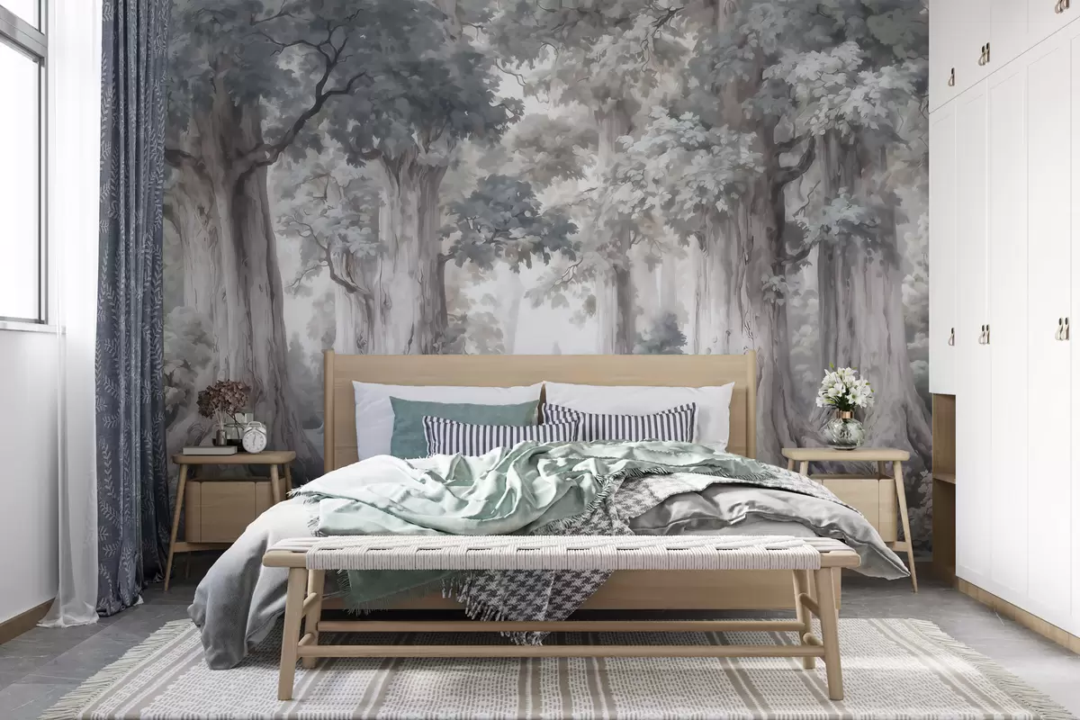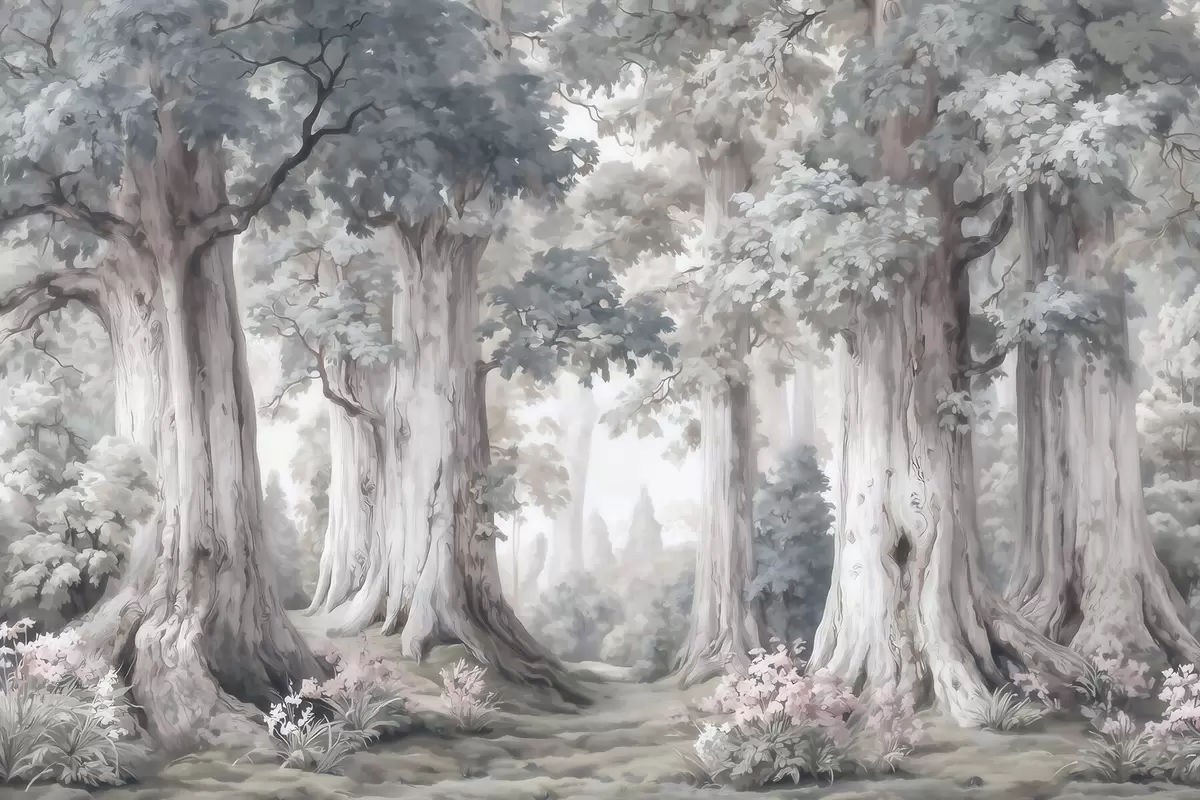 Fototapeedid Muinasjutuline mets kõrgetega puudega ja pehme, vaoshoitud värvipalettiga akvarellistiilis Nr w09849
