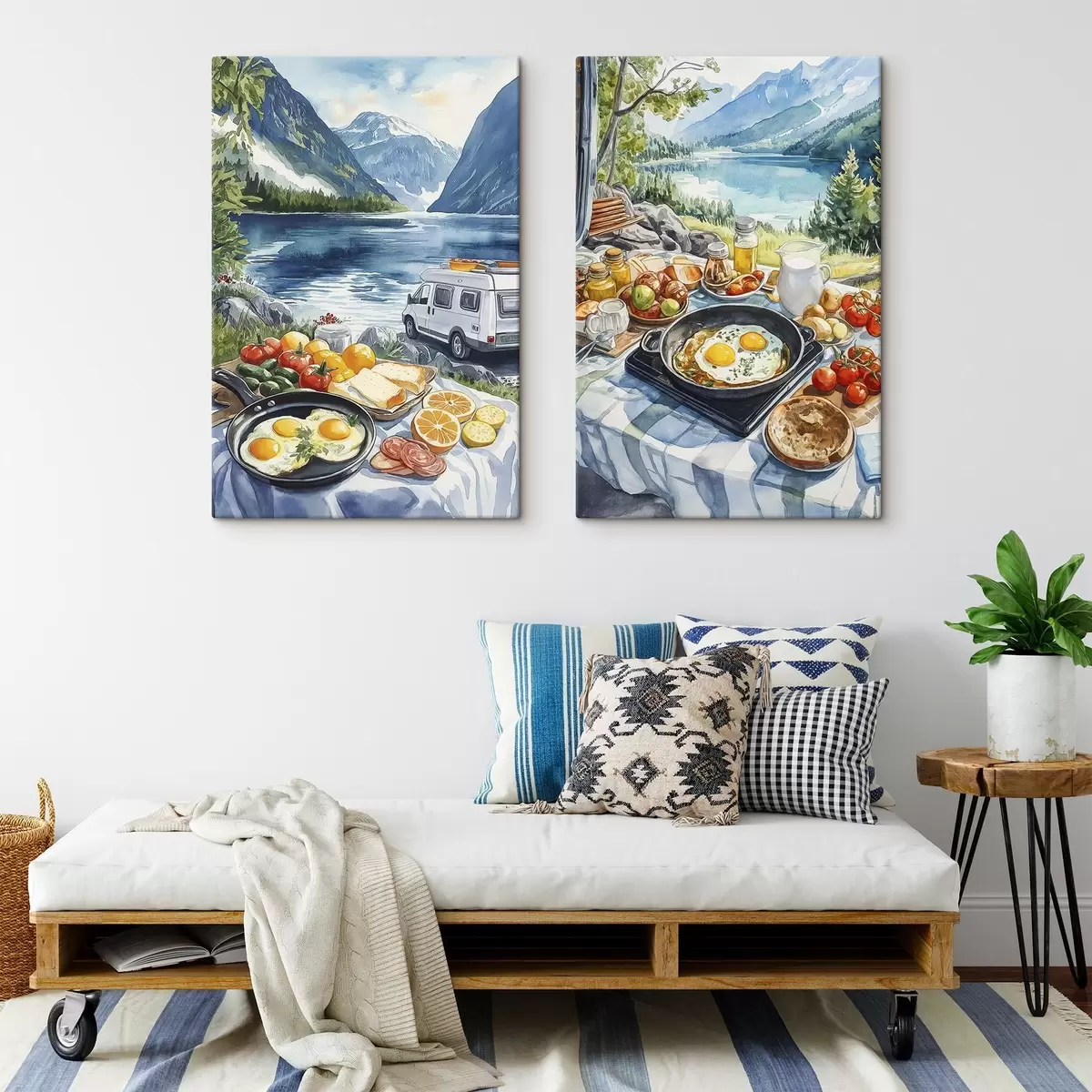 Maalid Hommikusöök looduses, reisimine, õues elamine, akvarellistiil, Norra Nr m00404