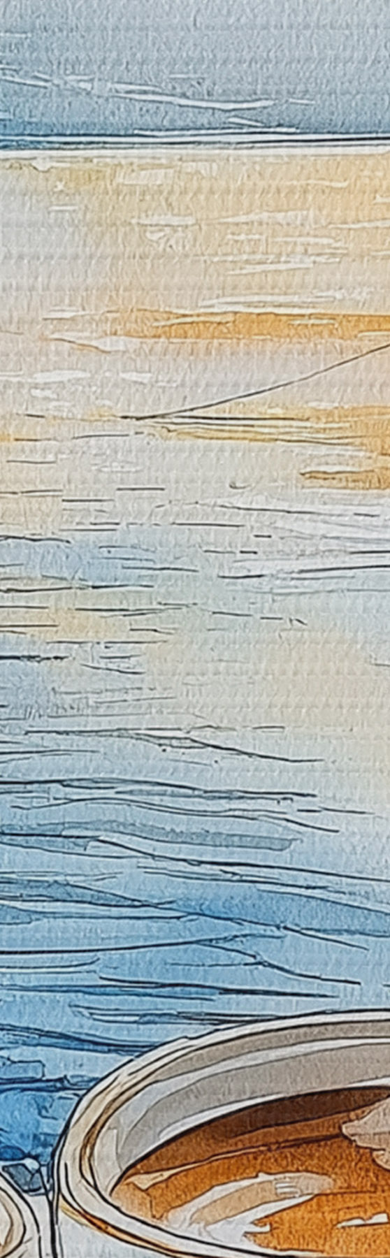 Maalid Päikeseloojang järvel koos kohvi, purjekate, looduse, reisimisega Nr m00407