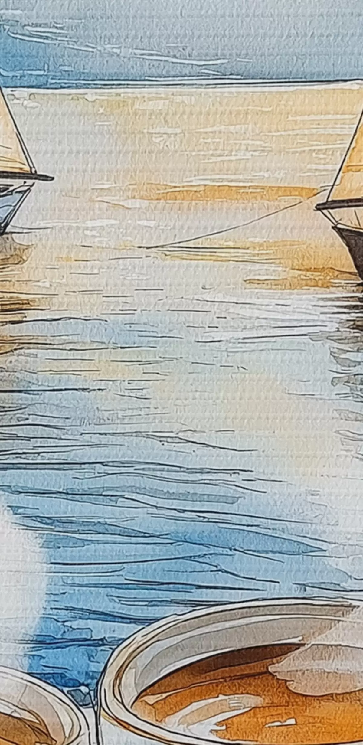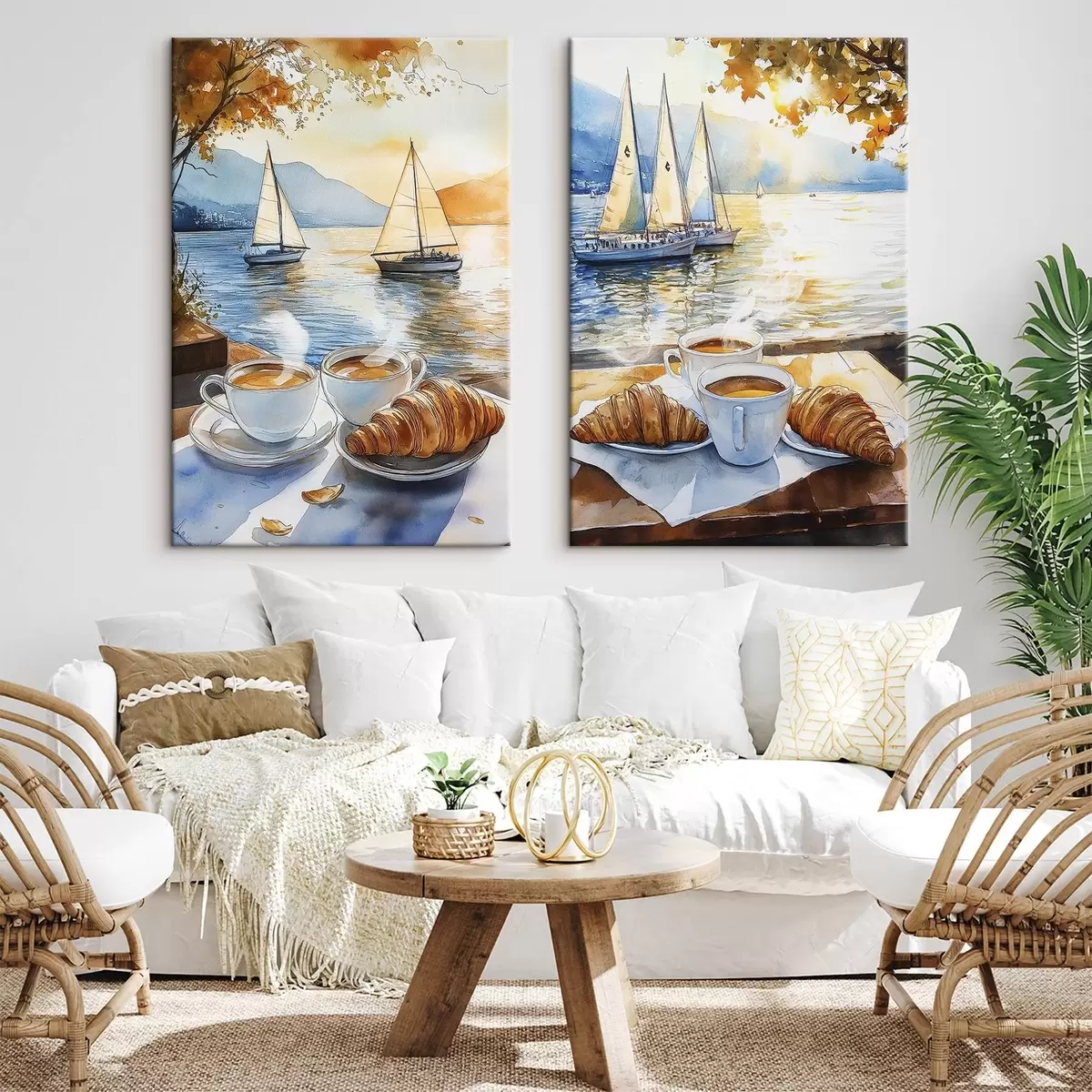 Maalid Päikeseloojang järvel koos kohvi, purjekate, looduse, reisimisega Nr m00407