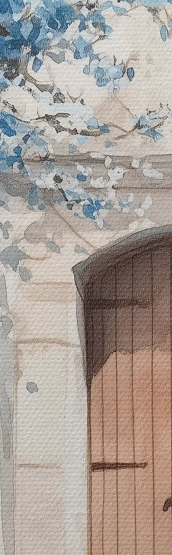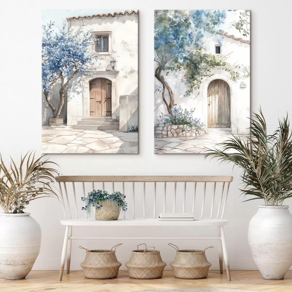 Maalid Kreeka valged majad koos õitsevate puudega, Vahemere, akvarellistiilis joonistus Nr m00419