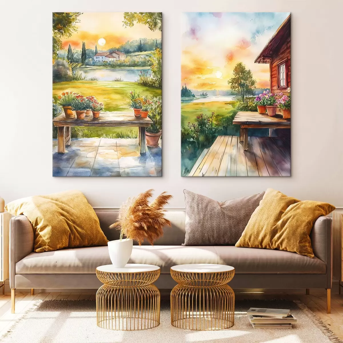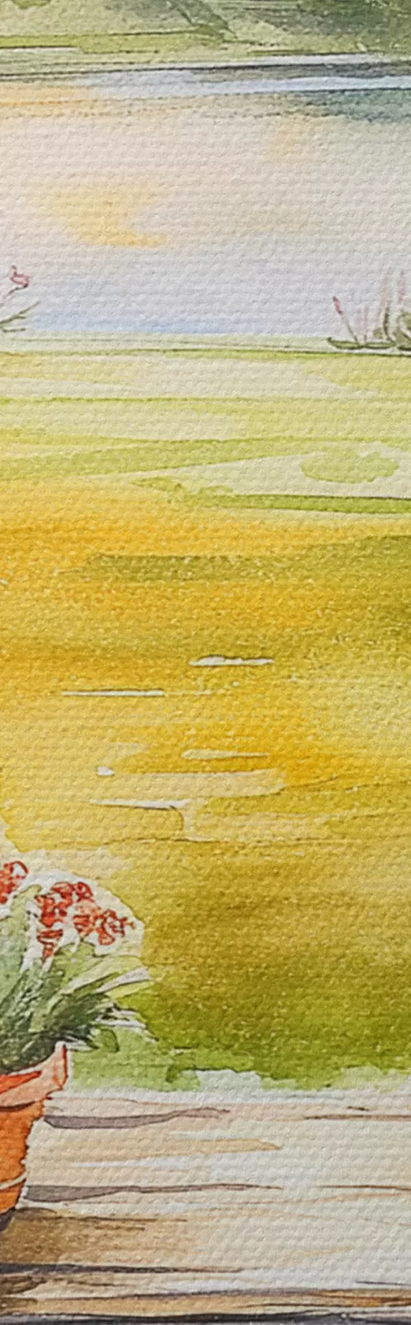 Maalid Suveküla, päikeseloojang, maaliline, lilled, järv, akvarellstiil Nr m00449