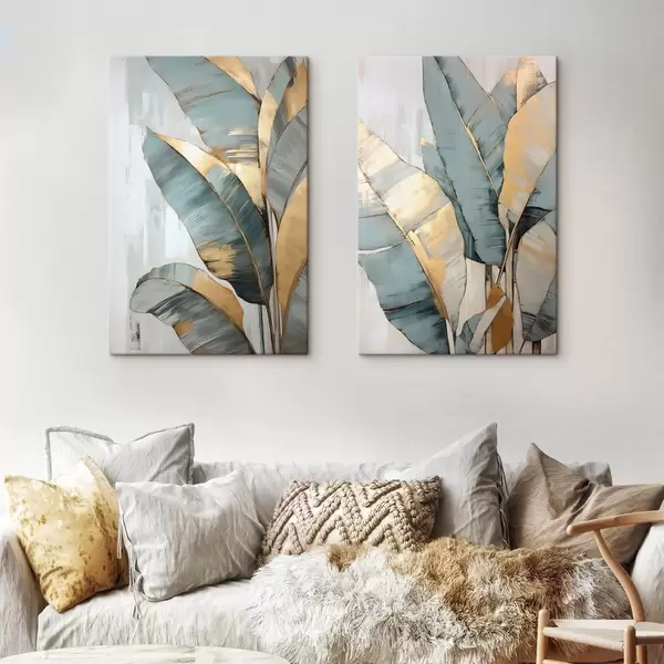 Maalid Valge abstraktse taustaga komplekt sinise, halli ja kollase värvi banaanilehti, millel on nähtavad pintslitõmbed Nr m00645