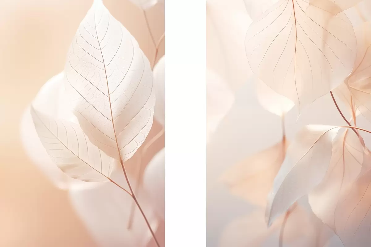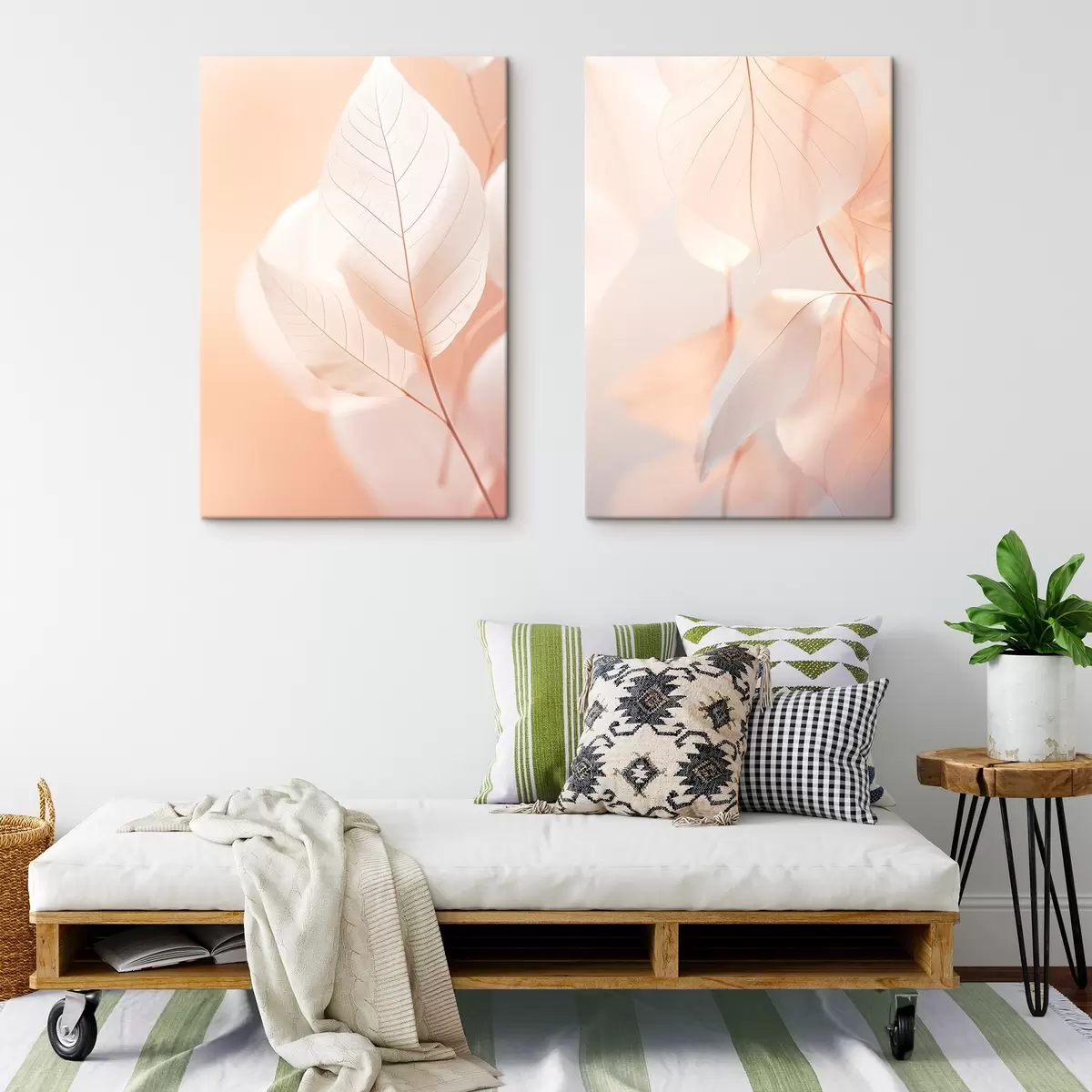 Maalid Läbilõikelised lehed koos õrnade veenidega, pehme virsiku ja valge värvipalett, hägune taust Nr m00647