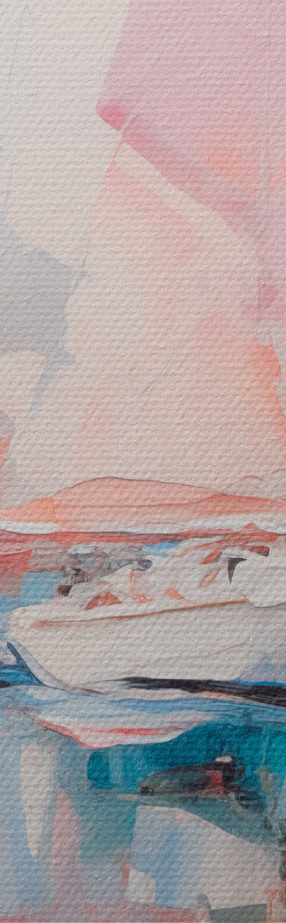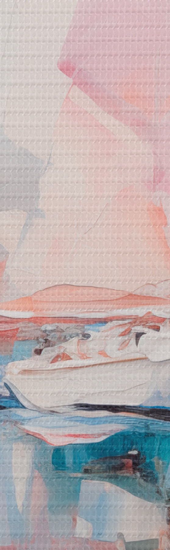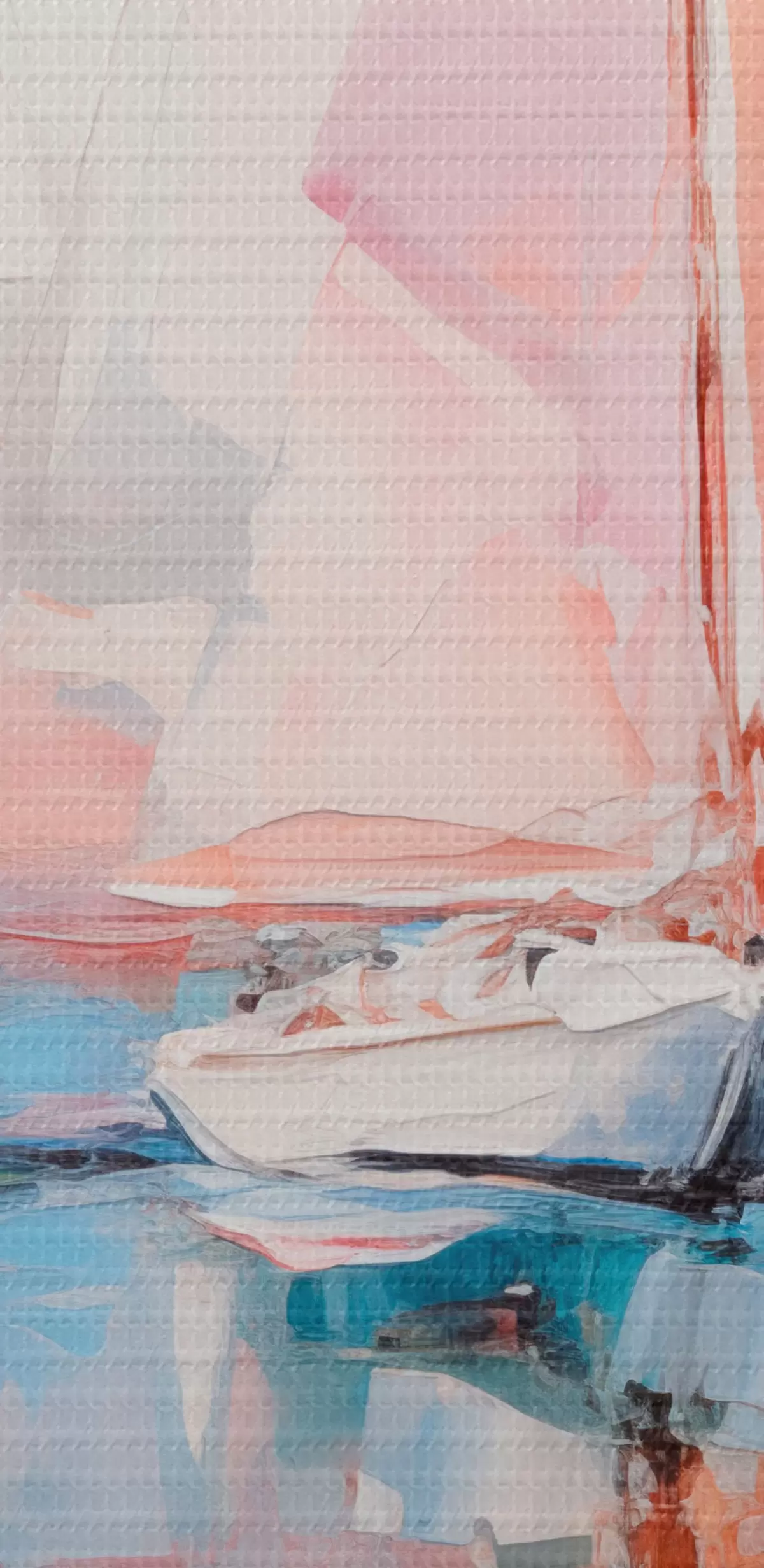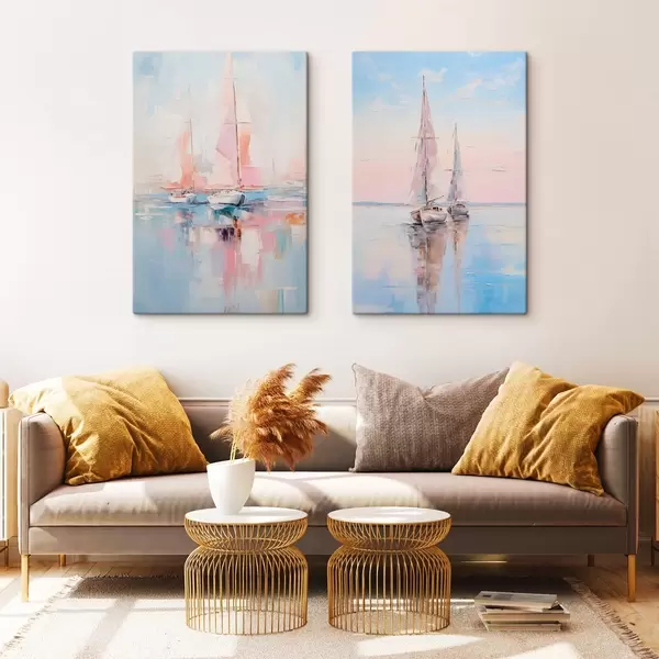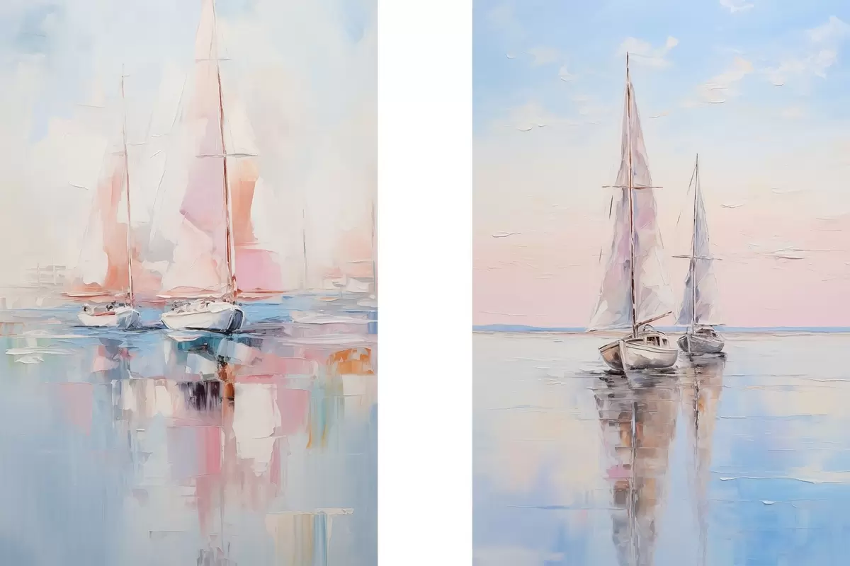 Maalid Roosade purjedega purjekad ujuvad rahulikul merel, paatide peegeldused vees, pehmed pastelsed värvid Nr m00648