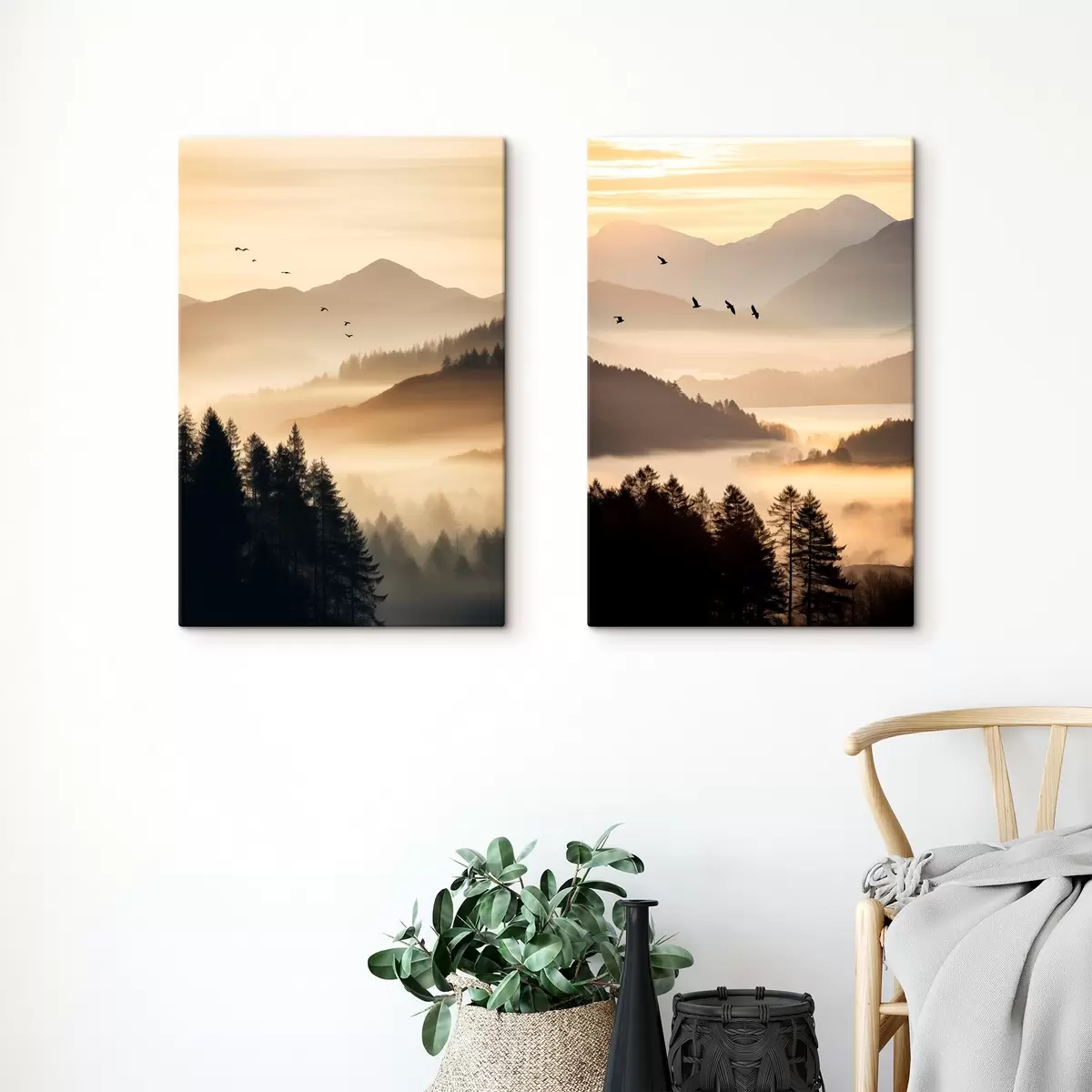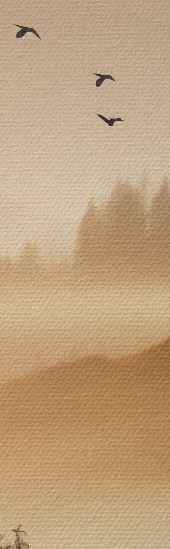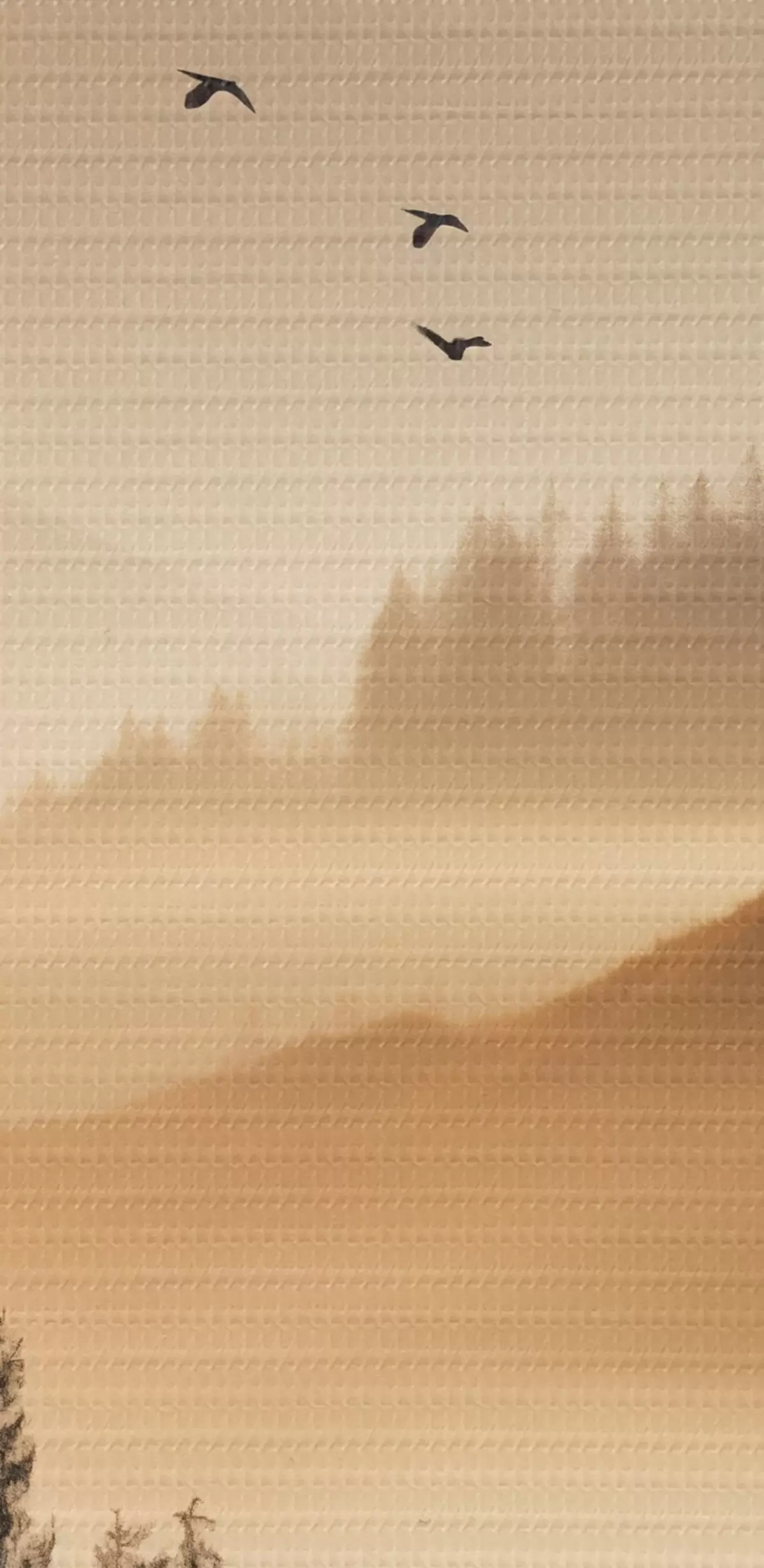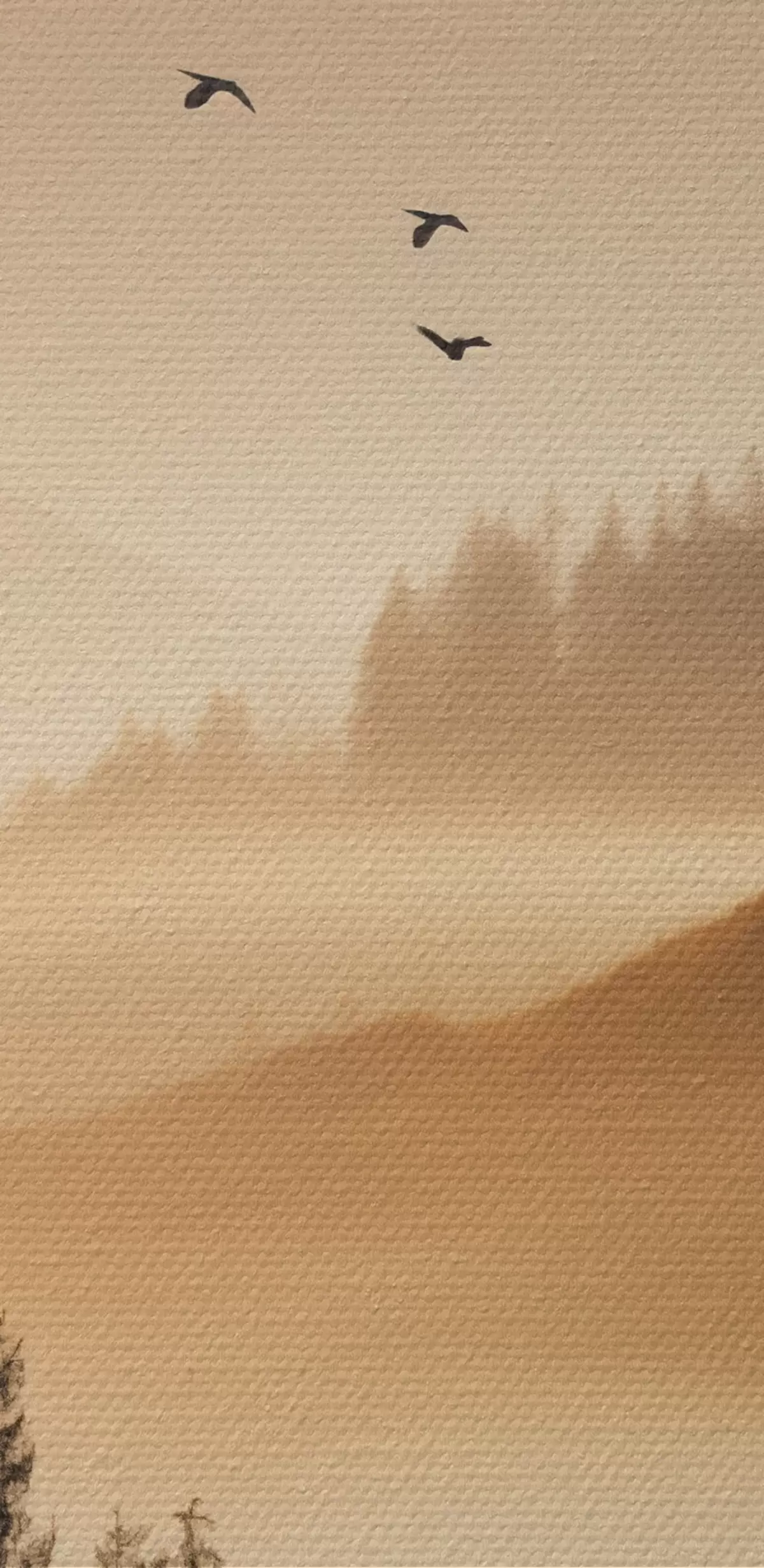 Maalid Mägimaastik koos metsa ja taevas lendavate lindudega , kõik kaetud paksu udukihiga päikesetõusu ajal Nr m00651